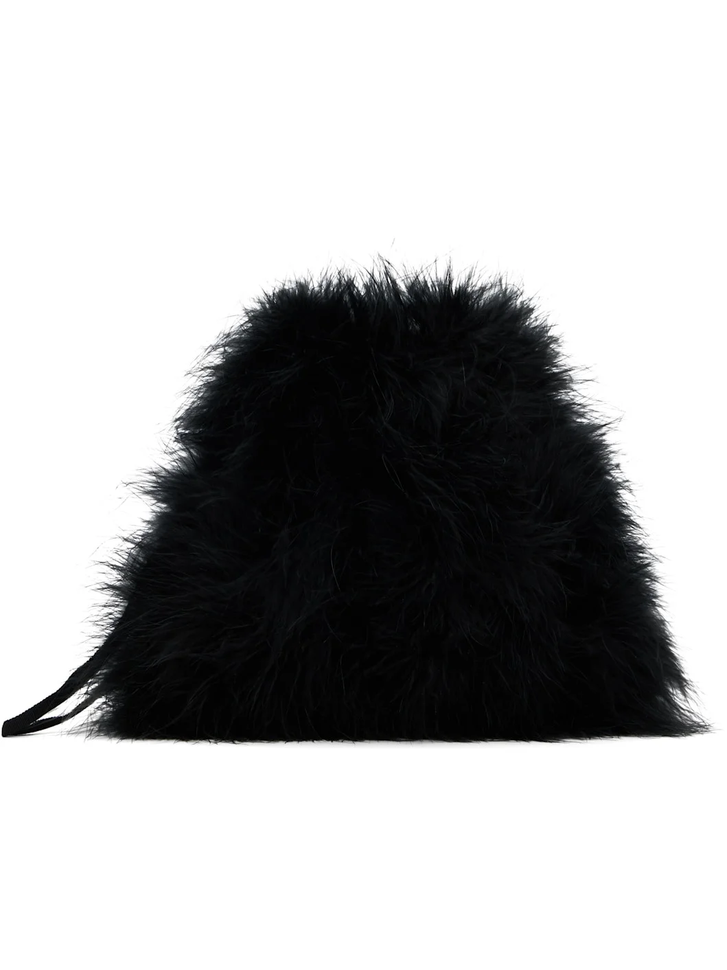 Turkey feather pouch. · Drawstring closure at throat · Card slot at interior · Woven lining · H9" x W9" Supplier color: Noir Body: 100% turkey feather. Lining: 100% polyester. Made in France 252594F048000