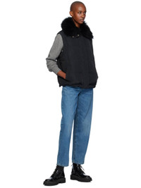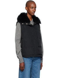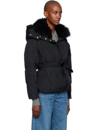 Down-filled and quilted polyester taffeta jacket. · Press-stud throat guard at detachable hood · Shearling trim at funnel neck · Zip closure with press-stud placket · Welt pockets · Bungee-style drawstring at hem · Detachable self-tie belt · Detachable sleeves · Elasticized cuffs · Full satin lining Supplier color: Black Fill: 90% duck down, 10% duck feather. Body: 100% polyester. Trim: 100% lambskin. Lining: 100% polyester. Made in France 242594F061006