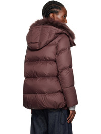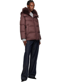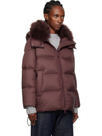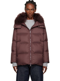 Down-filled quilted nylon taffeta jacket. · Detachable shearling-lined hood · Two-way zip closure · Welt pockets · Bungee-style drawstrings at hem · Zip vent at side seams Supplier color: Chianti Fill: 95% duck down, 5% duck feather. Body 1: 100% polyamide. Body 2: 100% lambskin. Trim: 68% polyester, 26% viscose, 6% elastane. Made in France 252594F061000