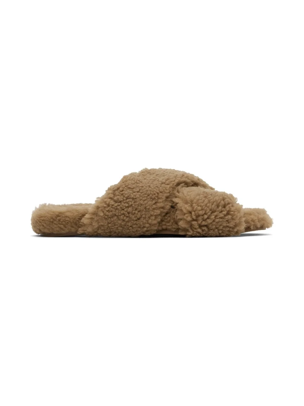 Shearling slippers in tan. · Open toe · Criss-crossing straps at vamp · Logo-embossed leather patch at footbed · Treaded rubber sole Supplier color: Madeleine