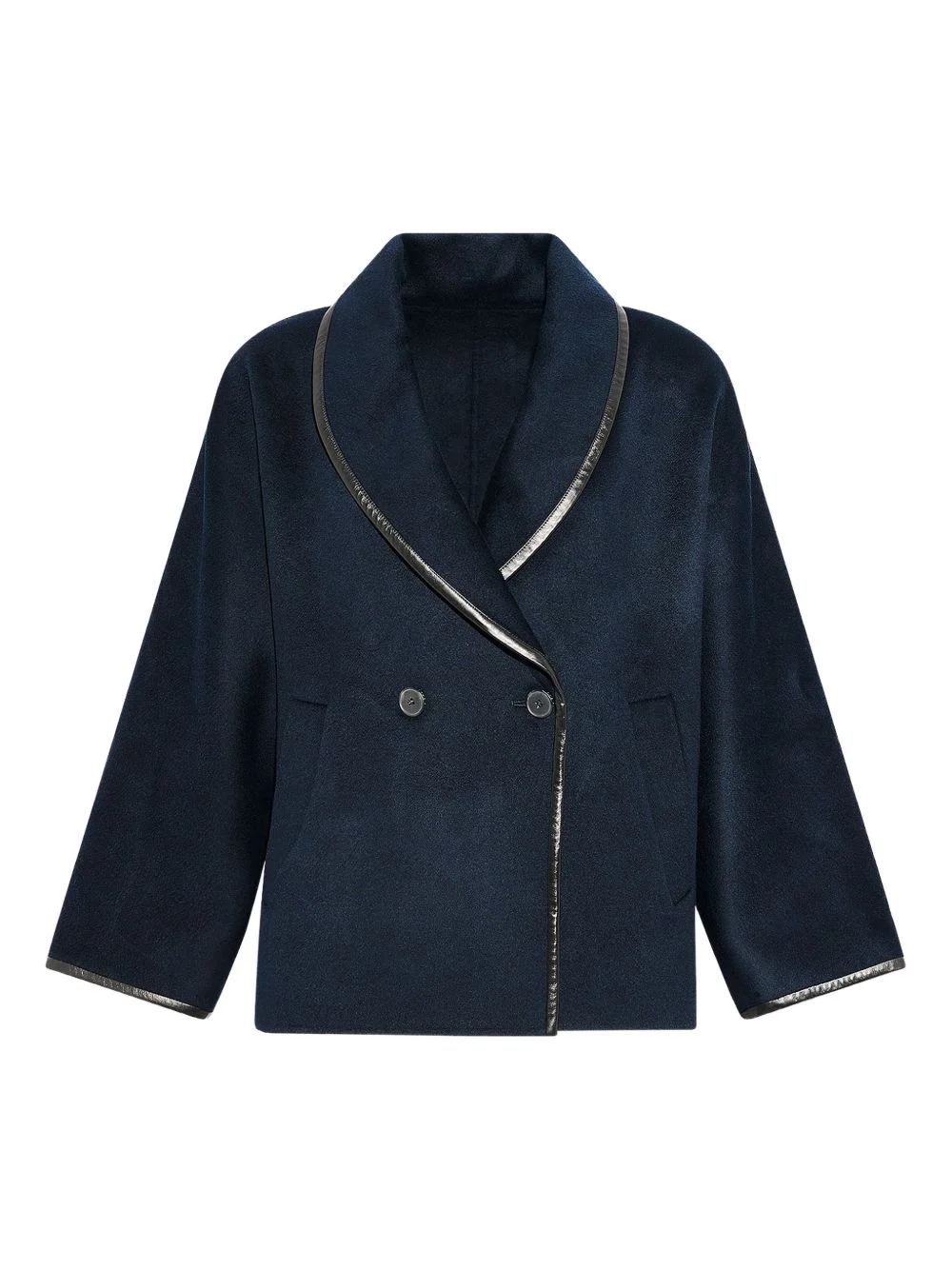 double-breast coat Highlights - Dark blue - Double-breasted - Button fastening - Trimmed edges - Wide lapels Made in France Composition Wool 81%, Lamb Skin 10%, Cashmere 9% Washing instructions Read Manufacturer Guidelines