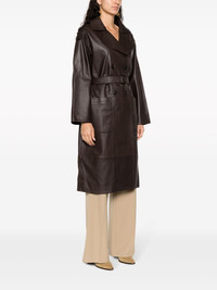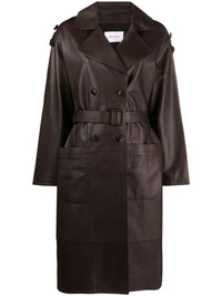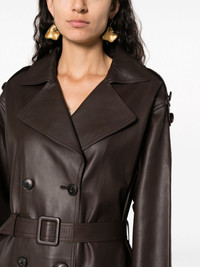 double-breasted leather trench coat Highlights - Chocolate brown - Lambskin - Epaulettes - Spread collar - Double-breasted button fastening - Belted waist - Long sleeves - Two front patch pockets - Mid-length Made in France Composition Outer: Lamb Skin 100% Lining: Polyester 100% SIZE & FIT Model measurements Height 5 ft 10 in(1.79 m) Bust/Chest 33.07 in(84 cm) Hips 35.82 in(91 cm) Waist 24.01 in(61 cm) FittingInformation Designed to be unstructured, offering a loose fit throughout The belt offers adjustability for fitted preferences Soft leather has a supple and smooth construction offering some flexibility This piece fits true to size – take your usual size Washing instructions Specialist Cleaning