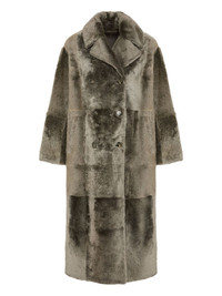 double-breasted patchwork coat Highlights - Grey - Lamb shearling - Double-breasted fastening - Patchwork design - Long sleeves - Wide notched collar Made in France Composition Outer: Lamb Shearling 100% Inner: Lamb Shearling 100%