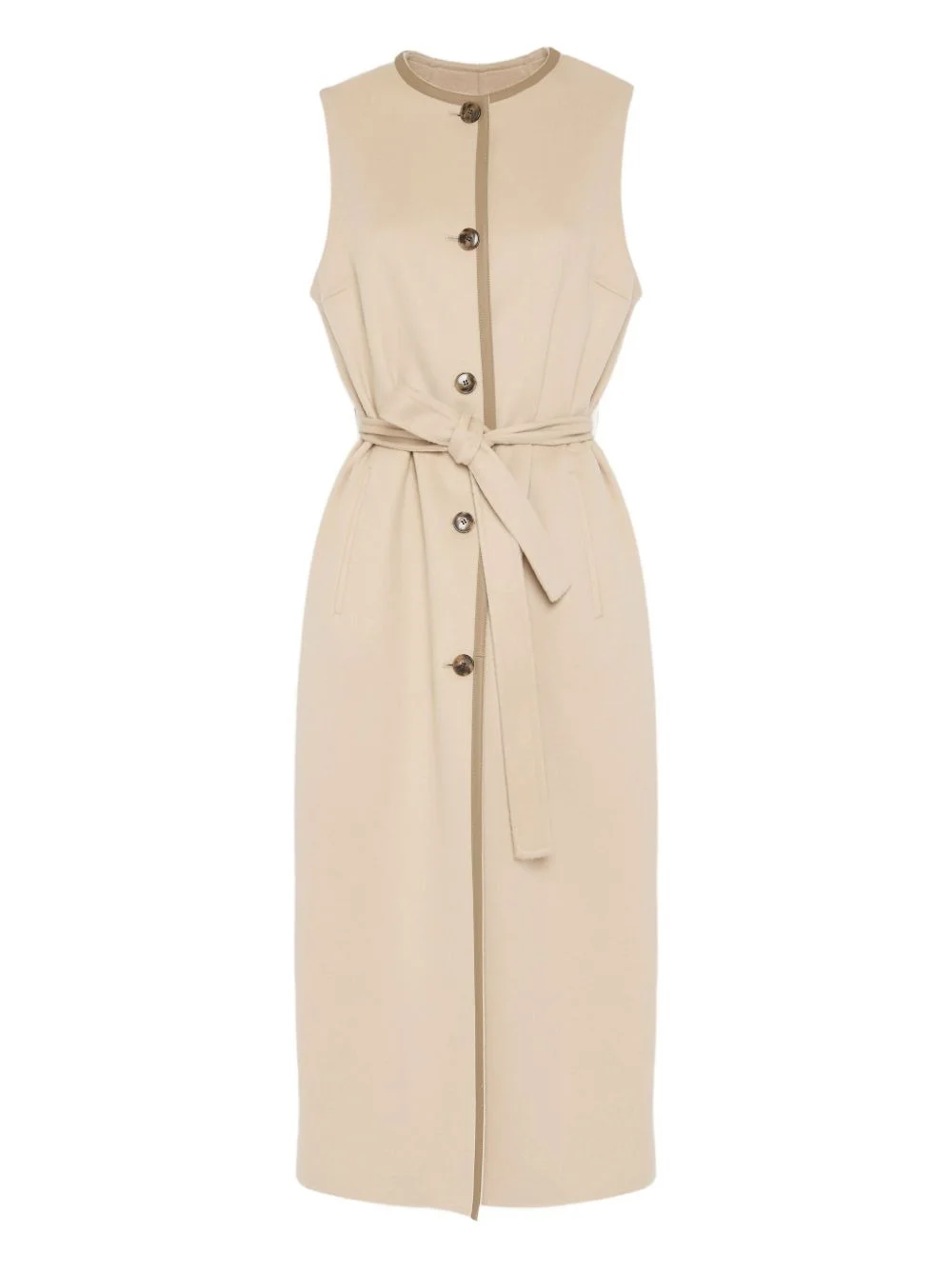 double-sided belted gilet Highlights - Beige - Front button fastening - Self-tie belt - Side splits - Contrasting trim Made in France Composition Lamb Skin 90%, Cashmere 10% Washing instructions Read Manufacturer Guidelines