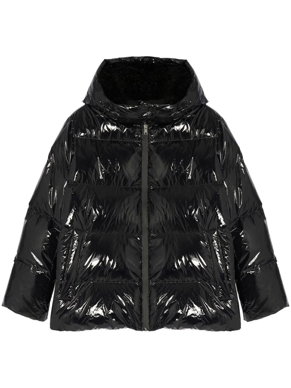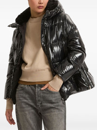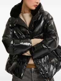 duck-down padded jacket Highlights - Black - Lambskin trim - Duck down - Padded design - Front zip fastening - Side zip fastening - Press-stud placket - Glossy finish - Classic hood - Two side welt pockets Made in France Composition Outer: Polyamide 60%, Polyester 20%, Lamb Fur 20% Lining: Polyamide 100%, Duck Down 95%, Duck Feathers 5%