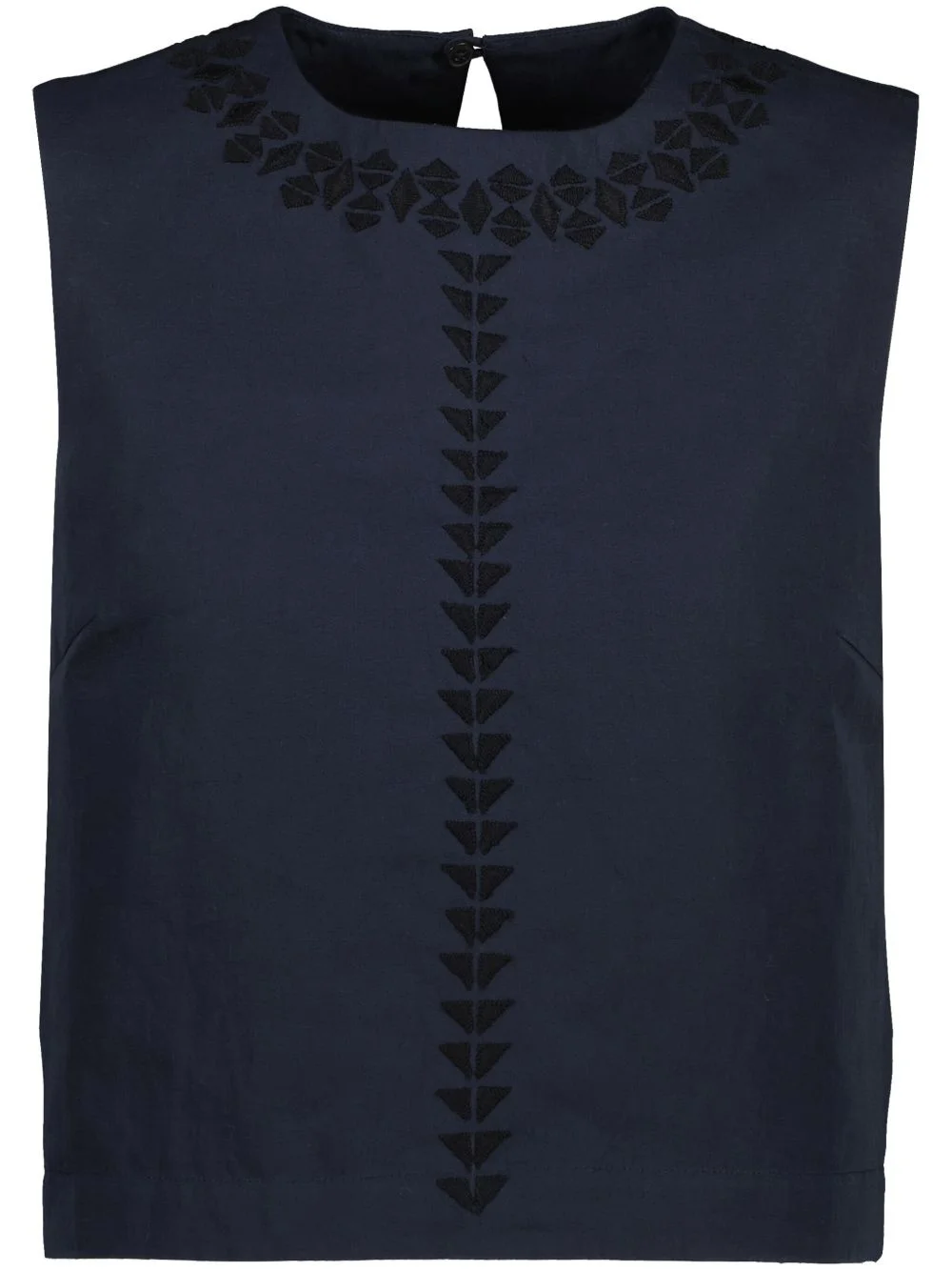 embroidered top Highlights - Prussian blue - Single rear button fastening - Round neck - Sleeveless Made in France Composition Cotton 58%, Organic Linen 30%, Fabric 12%