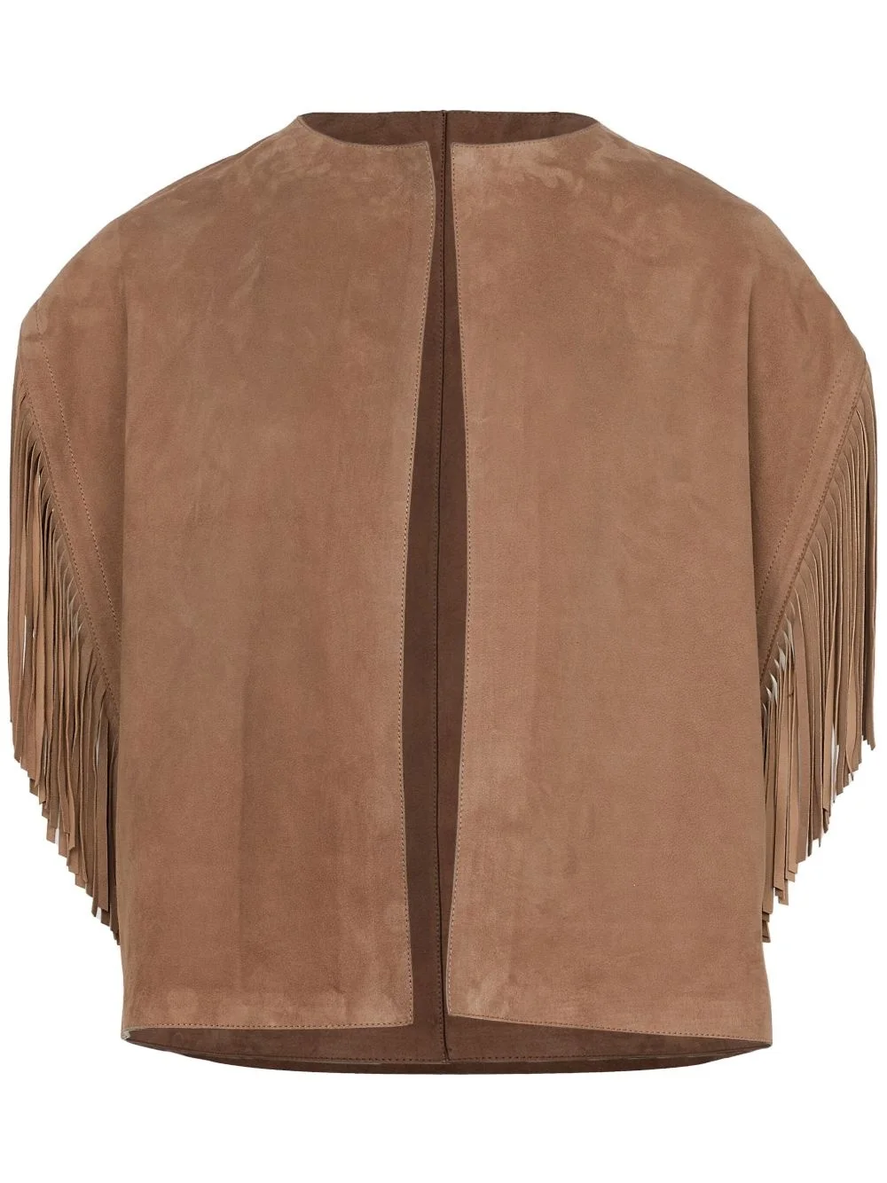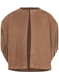 fringed-trim jacket Highlights - Camel brown - Open front - Round neck - Short sleeves Made in France Composition Outer: Lambskin 100% SIZE & FIT FittingInformation Designed for a boxy fit, intended for a loose fit throughout Suede leather has a soft and treated construction offering some flexibility Washing instructions Read Manufacturer Guidelines