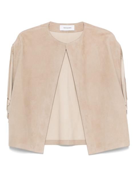fringed-trim jacket Highlights - Light beige - Open front - Collarless - Short sleeves Imported Composition Lamb Suede 100% SIZE & FIT Model measurements Height 5 ft 9 in(1.75 m) Bust/Chest 31.88 in(81 cm) Hips 34.64 in(88 cm) Waist 24.01 in(61 cm) FittingInformation Designed for a boxy fit, intended for a loose fit throughout Suede leather has a soft and treated construction offering some flexibility Washing instructions Specialist Cleaning
