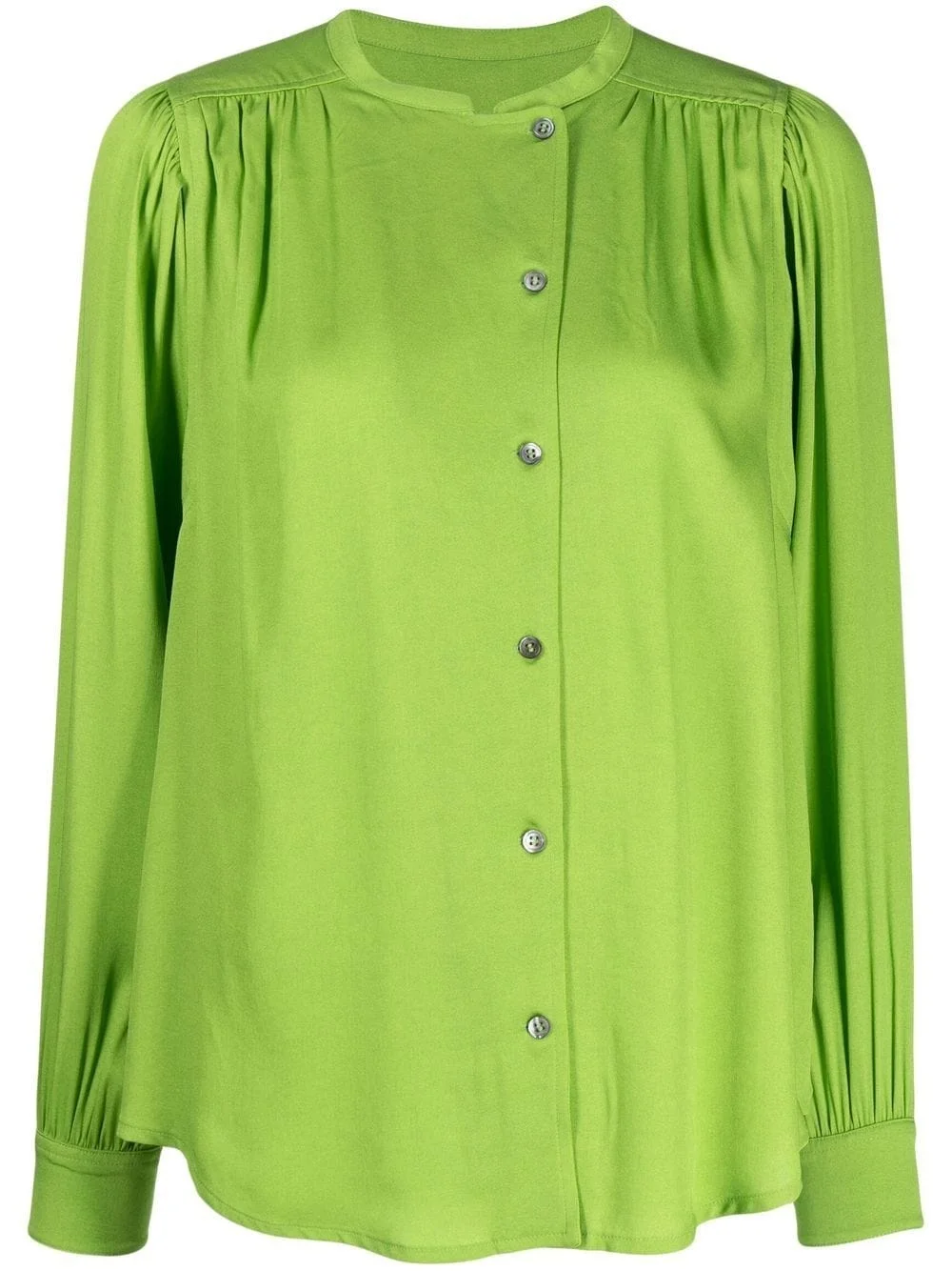 gathered-detail off-centre blouse apple green gathered detailing curved hem off-centre front button fastening buttoned-cuff sleeves long sleeves Made in France Composition Body: Viscose 100% Washing instructions Dry Clean Only