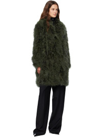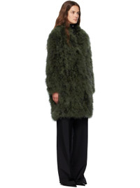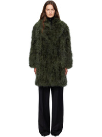 Turkey feather coat. · Shawl collar · Hook-eye closure · Welt pockets at waist · Silk satin lining Supplier color: Amazone Body: 100% turkey feathers. Lining: 100% silk. Made in France 252594F062027