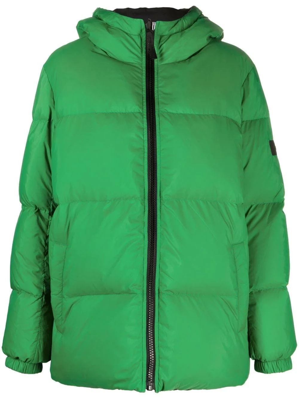 hooded down-padded jacket bright green padded design down-feather filling quilted finish logo patch at the sleeve classic hood high neck front zip fastening long sleeves elasticated cuffs slip pockets to the sides Made in France Composition Outer: Polyamide 100% Lining: Down 90%, Duck Feathers 10% SIZE & FIT Model measurements Height 5 ft 10 in(1.79 m) Bust/Chest 31.49 in(80 cm) Hips 35.03 in(89 cm) Waist 23.62 in(60 cm) FittingInformation This piece fits true to size. We recommend you get your regular size Cut for a loose fit Made with a mid-weight non-stretch fabric Washing instructions Hand Wash