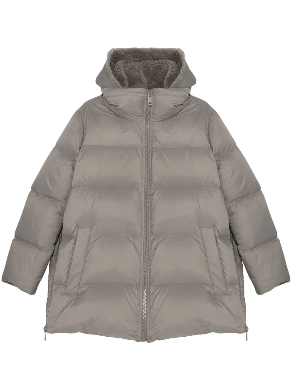 hooded puffer jacket Highlights - Ash grey - Feather down - Padded design - Front press-stud and zip fastening - Leather hood - Long sleeves - Two side welt pockets - Faux-shearling lining - Straight hem Made in France Composition Outer: Cotton 80%, Lamb Skin 20% Lining: Duck Down 95%, Duck Feathers 5%
