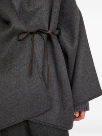 hooded wrap coat Highlights - Charcoal grey - Wrap front - Leather tie fastening - Hooded neckline - Wide sleeves - Double-sided wool blend Made in France Composition Outer: Lamb Skin 100%, Organic Wool 90%, Cashmere 10% Washing instructions Read Manufacturer Guidelines