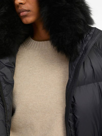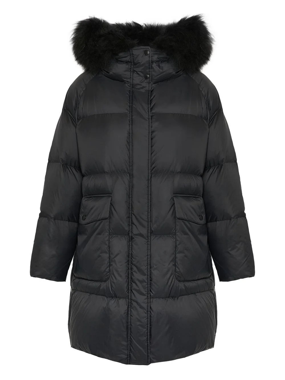 lambshearling-hooded down jacket Highlights - Black - Lambshearling trim - Hooded neckline - Quilted design - Long sleeves - Flap pockets Made in France Composition Outer: Lamb Shearling 100%, Polyamide 100% Trims: Duck Down 95%, Duck Feathers 5% Washing instructions Read Manufacturer Guidelines