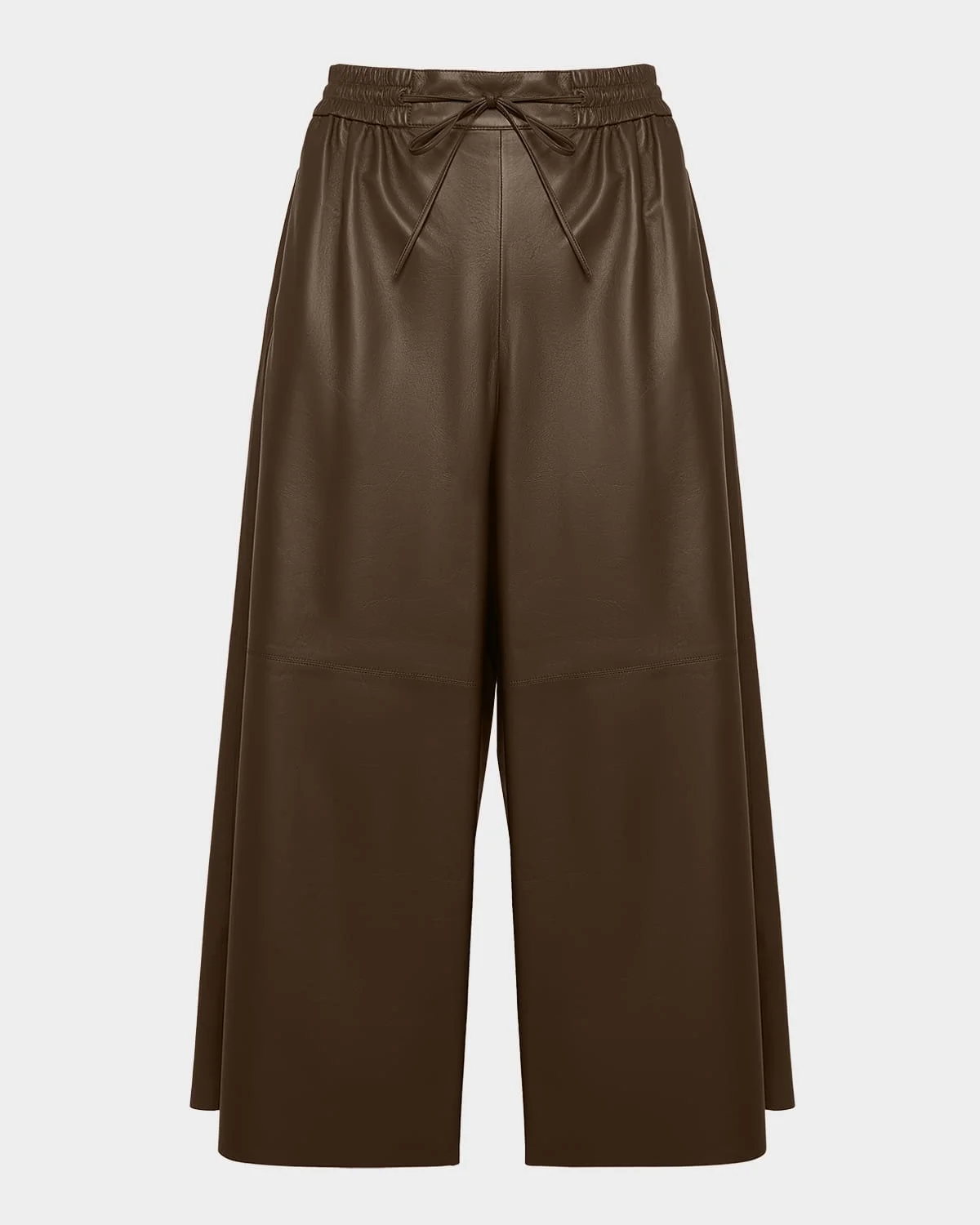 These Yves Salomon & nbsp;culotte pants are crafted from genuine lambskin leather and detailed with a drawstring waistband for comfort. Mid-rise; sits high on the hip Side pockets & nbsp; Wide legs Cropped length Pull-on style & nbsp; Leather Lining: Viscose/polyethylene terephtlatate (PET) Professional cleaning recommended & nbsp; Made in Italy SIZE & FIT Model measurements: 5 & apos;10" tall Model is wearing a US size 4/Small