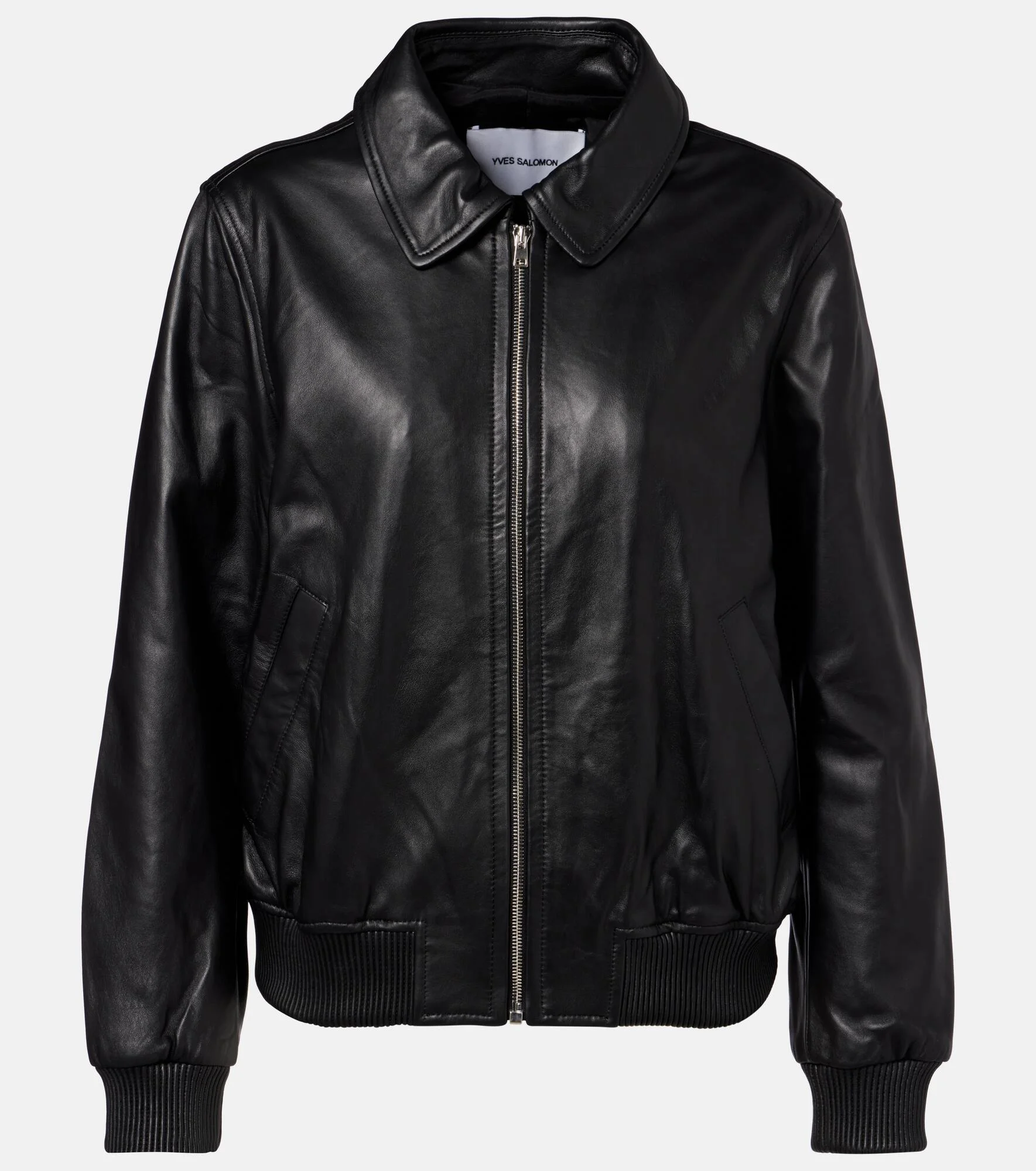 Rooted in a 100-year history, Yves Salomon's exquisite French craftsmanship produces winter wear that blends function and elegance. This jacket showcases a smooth leather construction, secured with a high neck and zipped front. Product Details - Material: 100% lamb leather - Care instructions: specialist clean - Made in France - Designer color name: Noir - Item color: black - Lining: 57% viscose, 43% polybutylene terephthalate - Hardware color: silver - Collar: classic (Straight point) - Closure: zipped front - Pockets: welt pockets - Cuff: ribbed, elasticated - Hem: ribbed, elasticated - Fully lined - Item number: P01096173 Size & Fit - True to size - Straight fit - Elasticated hem - Non-stretchy fabric - Falls to the hip - The model seen in the picture is 178cm-5'10" and wearing a size FR 36