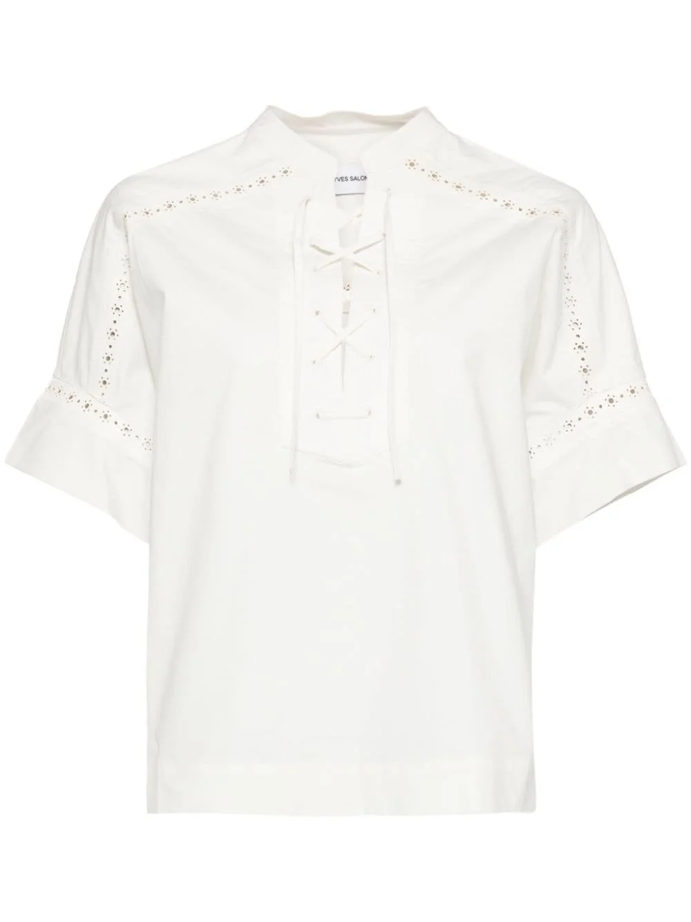 openwork short-sleeve shirt Highlights - Milk white - Stretch-cotton - Openwork areas - Band collar - Lace-up detailing - Short sleeves - Box-pleat detail - Straight hem - Unlined - Self-tie fastening Made in France Composition Cotton 94%, Elastane 6%