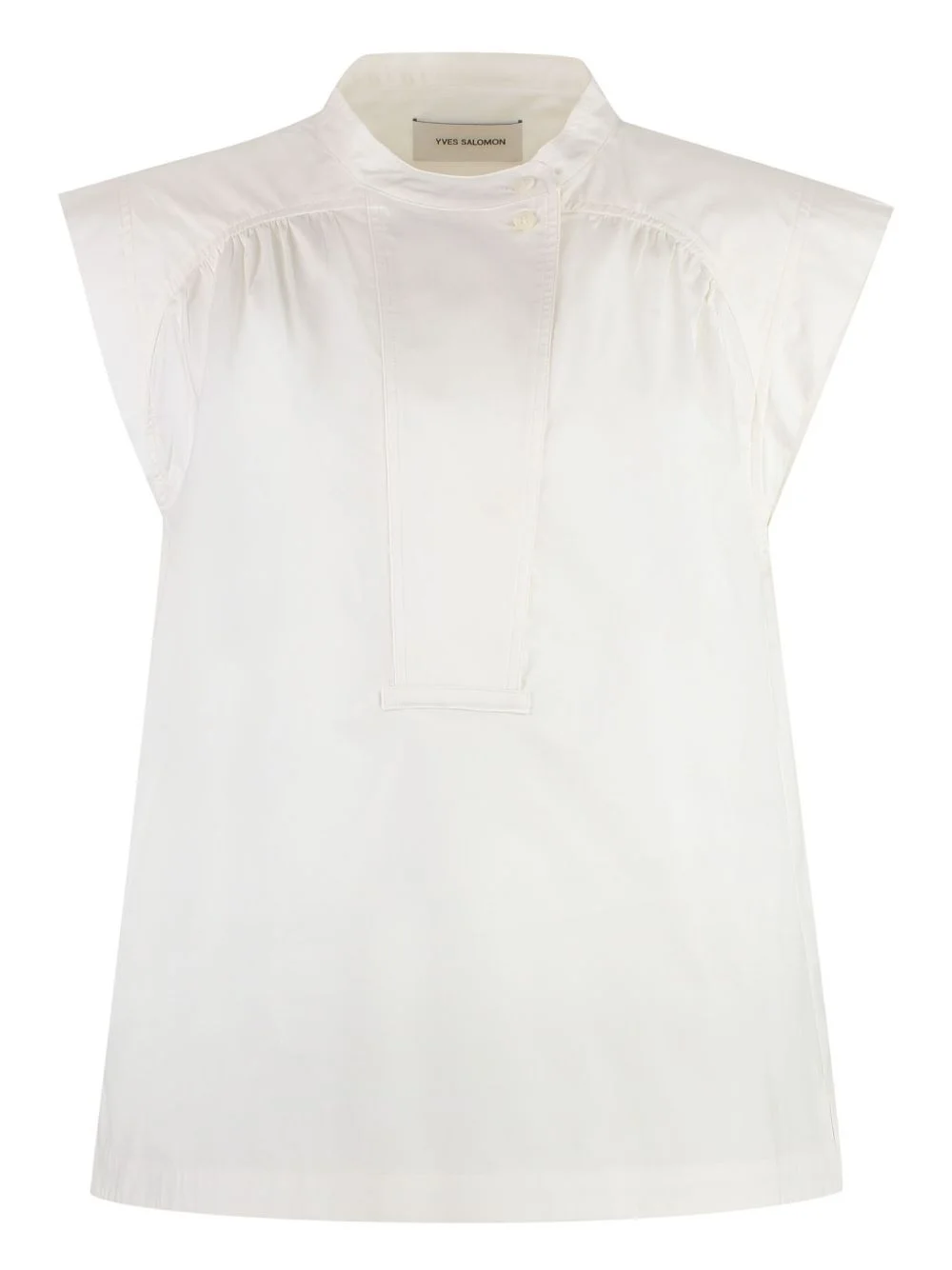poplin top Highlights - White - Short front button fastening - Band collar - Cap sleeves - Gathered detailing Made in France Composition Cotton 94%, Elastane 6% Washing instructions Machine Wash