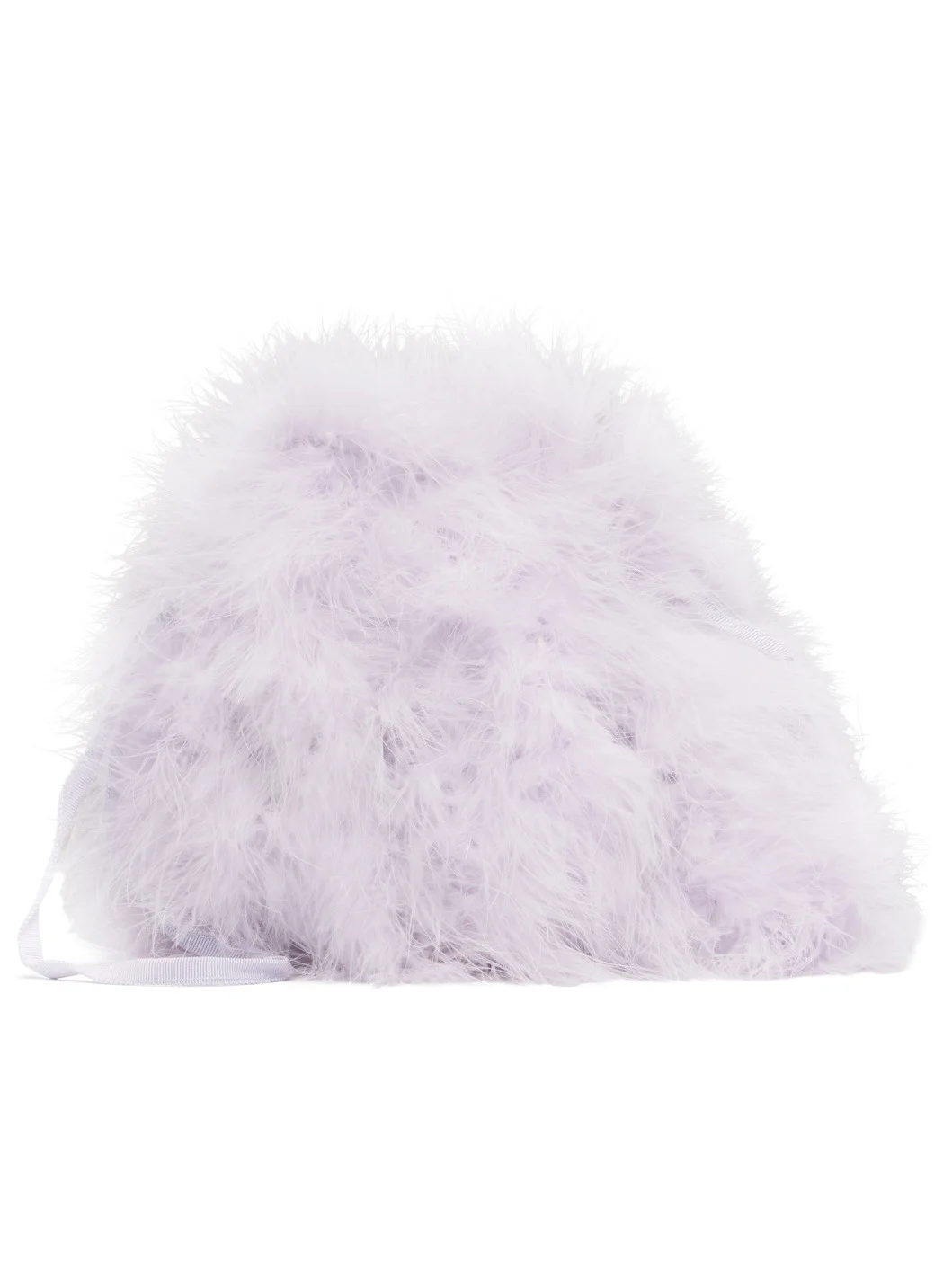 Turkey feather pouch. · Twin carry handles · Drawstring closure at throat · Card slot at interior · Plain-woven lining · H9" x W9" Supplier color: Glycine Body: 100% turkey feather. Lining: 100% polyester. Made in France 252594F048001