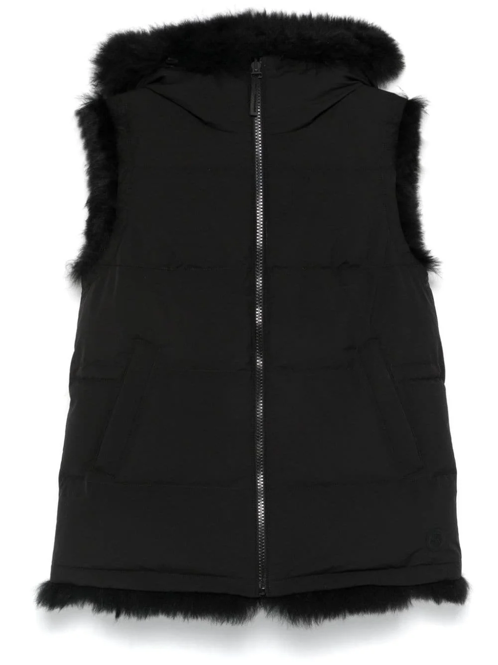 reversible gilet Highlights - Black - Padded design - Reversible - Front zip fastening - Drawstring hood - Funnel neck - Sleeveless - Internal drawstring fastening waist - Two side zip-fastening pockets - Fur lining - Straight hem Imported Composition Polyester 100%, Lamb Fur 100%, Lamb Skin 100% SIZE & FIT Model measurements Height 5 ft 11 in(1.8 m) Bust/Chest 33.07 in(84 cm) Hips 37.4 in(95 cm) Waist 25.19 in(64 cm) FittingInformation Designed to be unstructured, offering a loose fit throughout Made from a padded non-stretch fabric, giving it no natural elasticity