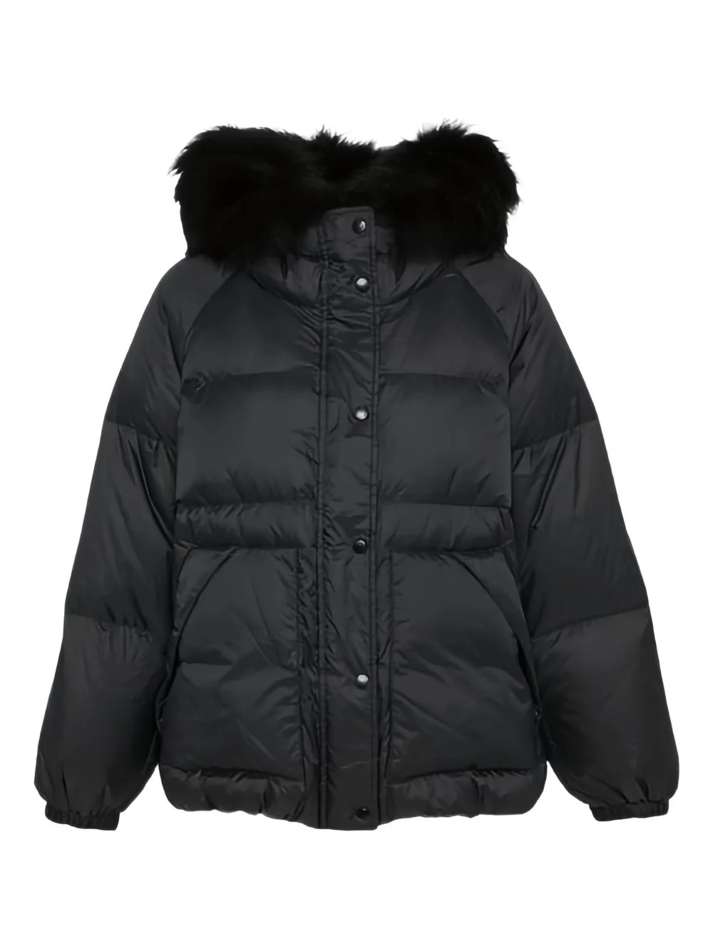 shearling-hooded jacket Highlights - Black - Shearling trim - Hooded - Front button fastening - Front pockets - Long sleeves Imported Composition Outer: Polyamide 100%, Lamb Shearling 100% Lining: Duck Down 95%, Duck Feathers 5% Washing instructions Machine Wash