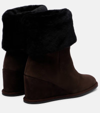 Rooted in a 100-year history, Yves Salomon's exquisite French craftsmanship produces winter wear that blends function and elegance. Made in Portugal from shearling-lined suede, these ankle boots are complete with wedge heels and rounded toes. Product Details - Upper: lamb leather (suede), shearling - Lining: shearling - Sole: shearling insole, rubber sole - Toe shape: round toe - Made in Portugal - Includes: shoe box - Designer color name: Dark Chocolate - Item color: brown, black - Item number: P01119665 Size & Fit - True to size - European sizes - 8cm-3" heel (size EU 38)