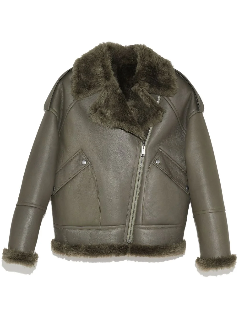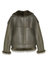 shearling-lining biker jacket Highlights - Olive green - Sheepskin - Smooth grain - Panelled design - Silver-tone hardware - Epaulettes - Notched collar - Off-centre front zip fastening - Drop shoulder - Long sleeves - Two front flap pockets - Straight hem - Shearling lining Made in France Composition Outer: Sheep Skin/Shearling 100% Lining: Sheep Skin/Shearling 100% Washing instructions Specialist Cleaning