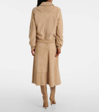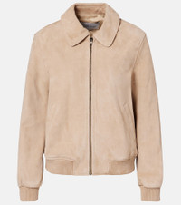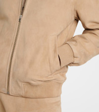 Rooted in a 100-year history, Yves Salomon's exquisite French craftsmanship produces winter wear that blends function and elegance. This bomber jacket is made from supple suede and features a zipped front, ribbed cuffs, and side welt pockets. Product Details - Material: 100% lamb leather (suede) - Care instructions: specialist clean - Made in France - Designer color name: Sandstorm - Item color: beige - Lining: 57% viscose, 43% polybutylene terephthalate - Hardware color: silver - Collar: classic (Straight point) - Closure: zipped front - Cuff: ribbed, elasticated - Hem: ribbed, elasticated - Fully lined - Includes: dust bag - Item number: P01096421 Size & Fit - True to size - Straight fit - Elasticated hem - Non-stretchy fabric - Falls to the hip - The model seen in the picture is 178cm-5'10" and wearing a size FR 36
