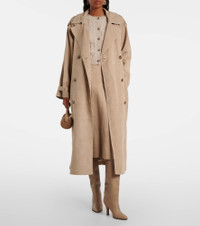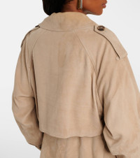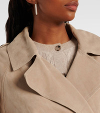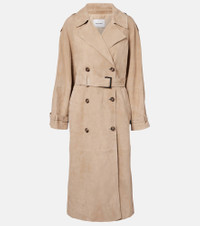 Rooted in a 100-year history, Yves Salomon's exquisite French craftsmanship produces winter wear that blends function and elegance. Cinched at the waist with a belt, this trench coat is crafted from suede in a double-breasted style. Product Details - Material: 100% lamb leather (suede) - Care instructions: specialist clean - Made in France - Designer color name: Sandstorm - Item color: beige - Lining: 57% viscose, 43% polybutylene terephthalate - Notched lapel - Epaulettes - Closure: double-breasted (six buttons) - Pockets: welt pockets - Belt loops - Detachable belt - Vent: single - Cuff: strap, buckle and loops - Fully lined - Item number: P01096418 Size & Fit - True to size - Loose fit, comes with belt - Non-stretchy fabric - slit length 40cm-15.5" - The model seen in the picture is 178cm-5'10" and wearing a size FR 36