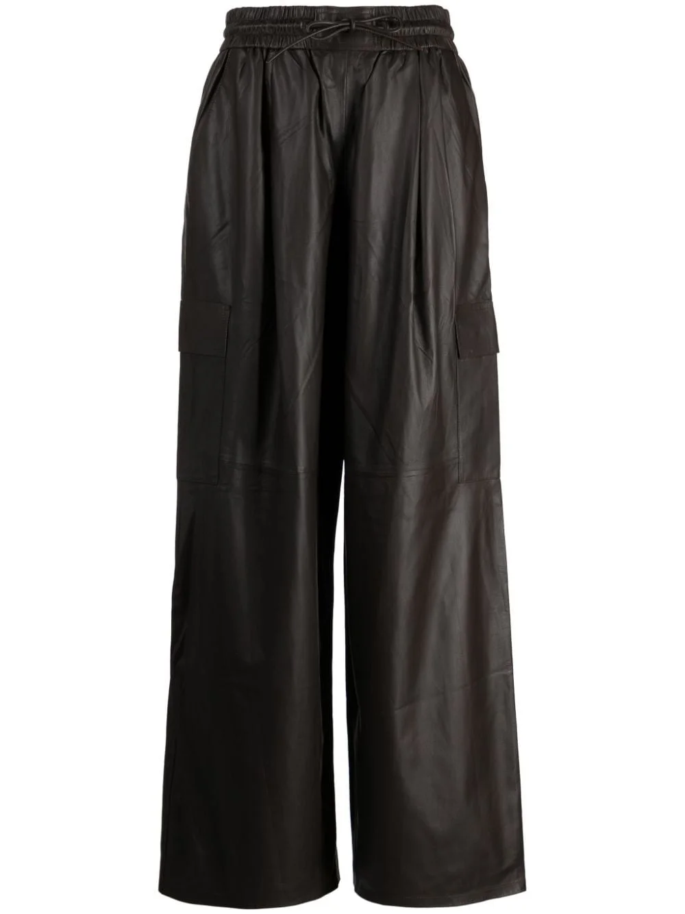 drawstring leather cargo trousers Highlights - Coffee brown - Lambskin - Smooth grain - Tonal stitching - Wide leg - Elasticated drawstring waistband - Two side slash pockets - Two rear patch pockets - Two side cargo pockets - Straight hem Made in France Composition Body: Lamb Skin 100% SIZE & FIT Measurement FRONT RISE 13.77 in(35 cm) INSIDE LEG 30.31 in(77 cm) HIPS 43.3 in(110 cm) WAIST 27.55 in(70 cm) Washing instructions Dry Clean Only