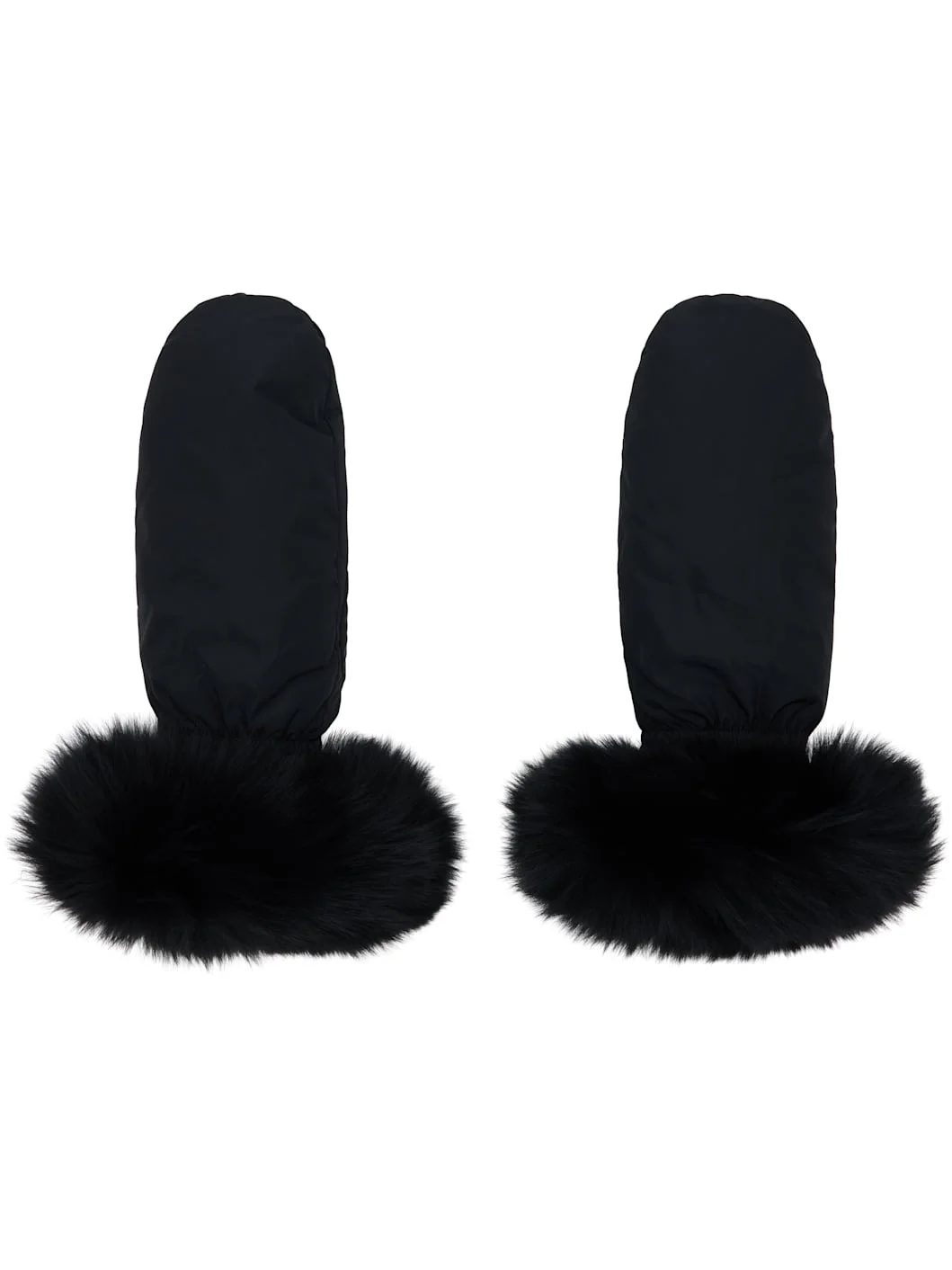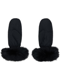 Pair of down-filled satin mittens. Fox fur trim at elasticized cuffs. Supplier color: Noir Fill: 90% duck down, 10% duck feather. Trim: 100% fox fur. Body: 100% polyester. Made in France 252594F012003