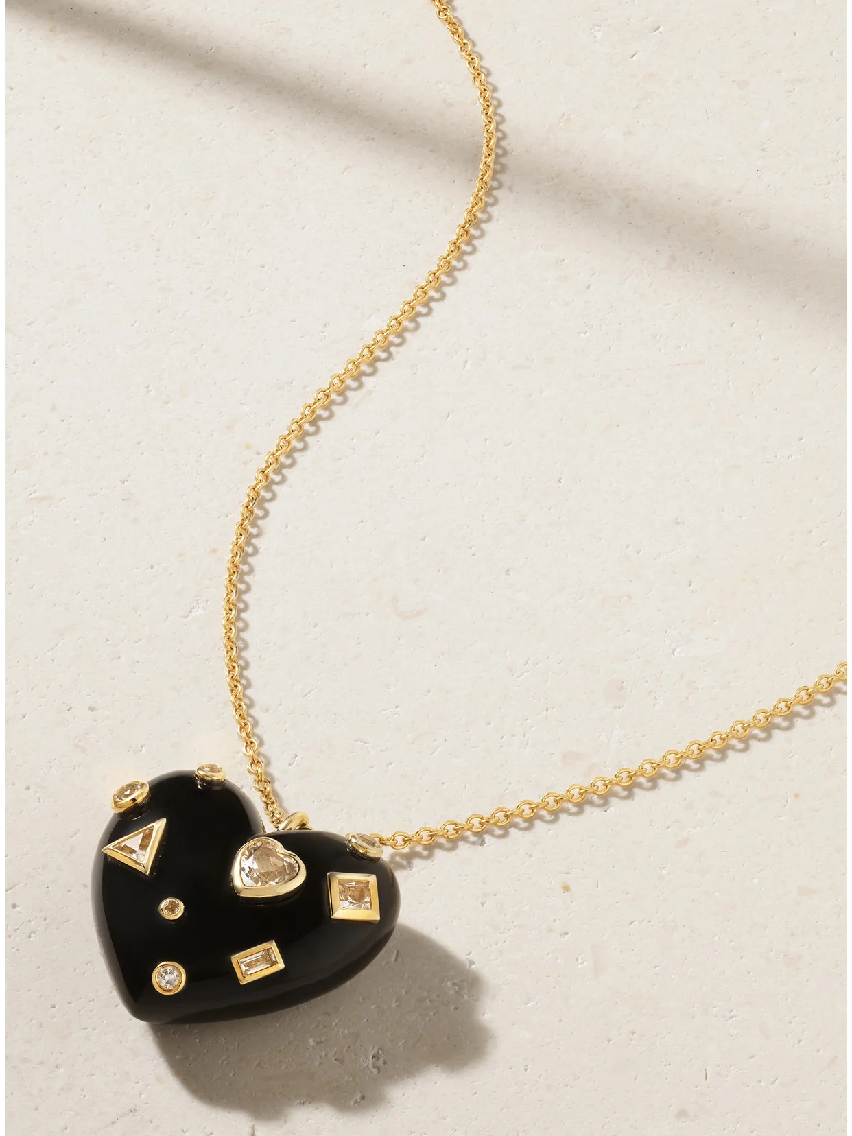 Yvonne Leon's whimsical designs make such thoughtful gifts. This necklace is cast from 9-karat gold and strung with a 3D heart pendant made from onyx and set with sparkling topaz.