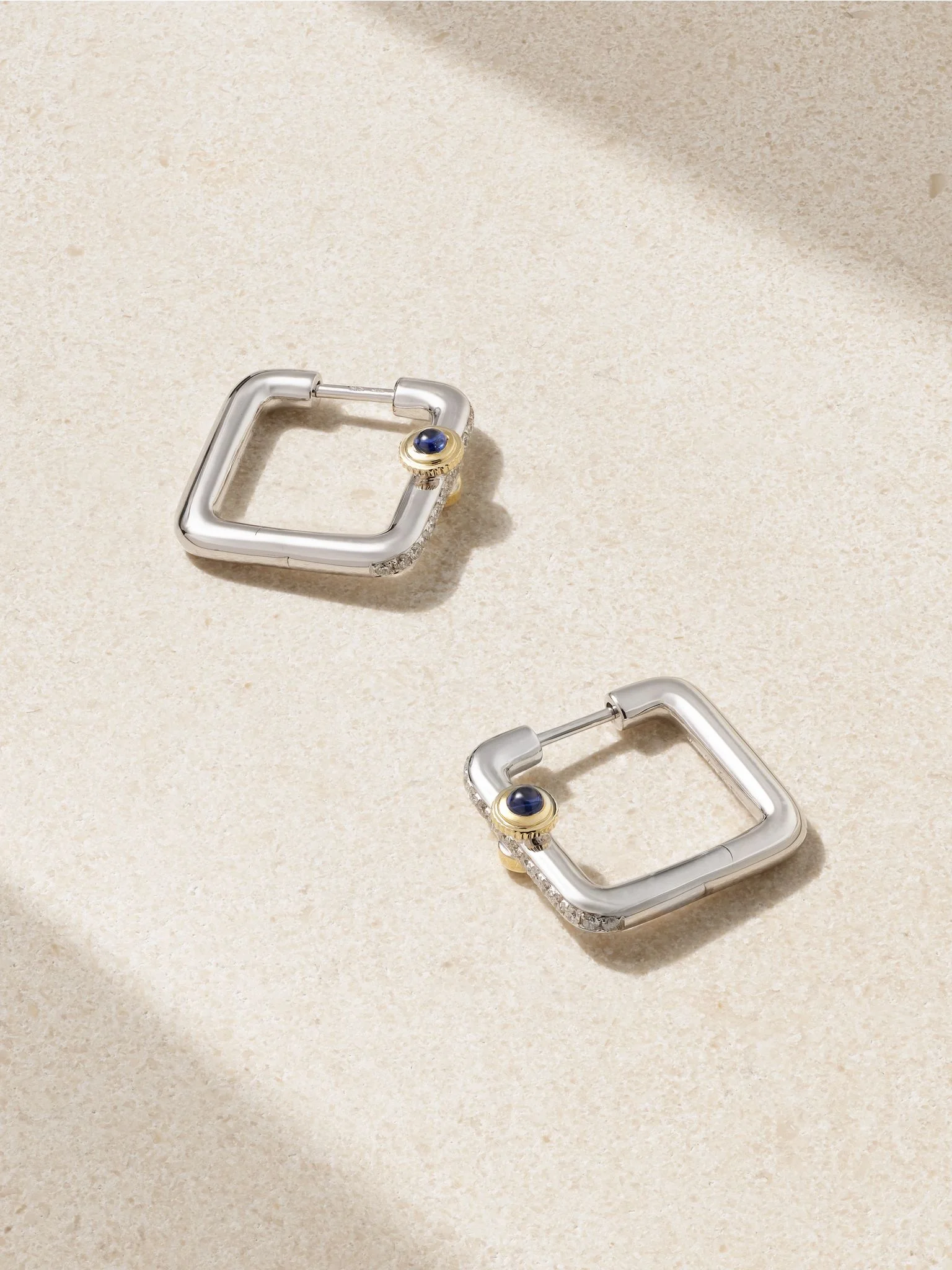 Yvonne Leon's earrings are part of the brand's 'Gousset' collection that's inspired by the craft of watchmaking. Handmade from 9-karat white gold, they have geometric hoops topped with sapphire-encrusted gear-like settings meant to resemble traditional crowns. The sparkling diamonds along the front add just the right amount of sparkle. Details & Care - Gray diamonds, total weight: 0.70-carats; sapphires, total weight: 0.44-carats - Post fastening for pierced ears - This piece has been certified in accordance with the Hallmarking Act 1973