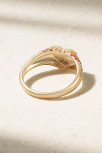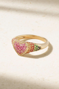 Yvonne Leon's 'Baby Chevaliere' ring is bursting with joy, color and sparkle. It's cast from 9-karat gold and set with a rainbow of sapphires amongst twinkling tsavorites. Show how big your heart is and gift it to someone who'll cherish it as much as they cherish you. Size & Fit - US sizing - Measurements can be found in the link below Details & Care - Yellow sapphires, total weight: 0.13-carats; pink sapphires, total weight: 0.21-carats; orange sapphires, total weight: 0.16-carats; blue sapphires, total weight: 0.03-carats; tsavorites, total weight: 0.06-carats - This piece has been certified in accordance with the Hallmarking Act 1973