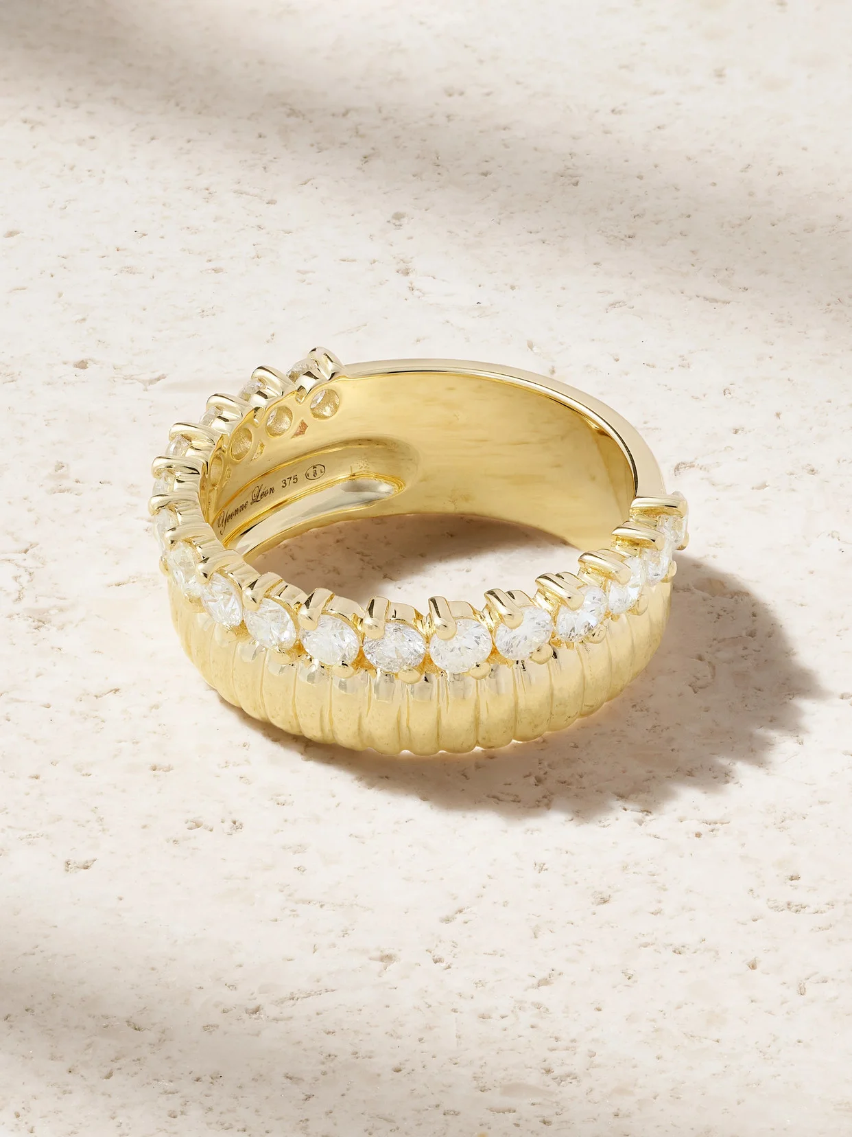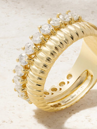 Yvonne Leon's ring creates the look of a curated stack without any of the effort. Handmade from 9-karat yellow and white gold, it features a ribbed band as well as one with a row of round-cut diamonds - the off-kilter prongs give the stones a unique, wavy shape at first glance.