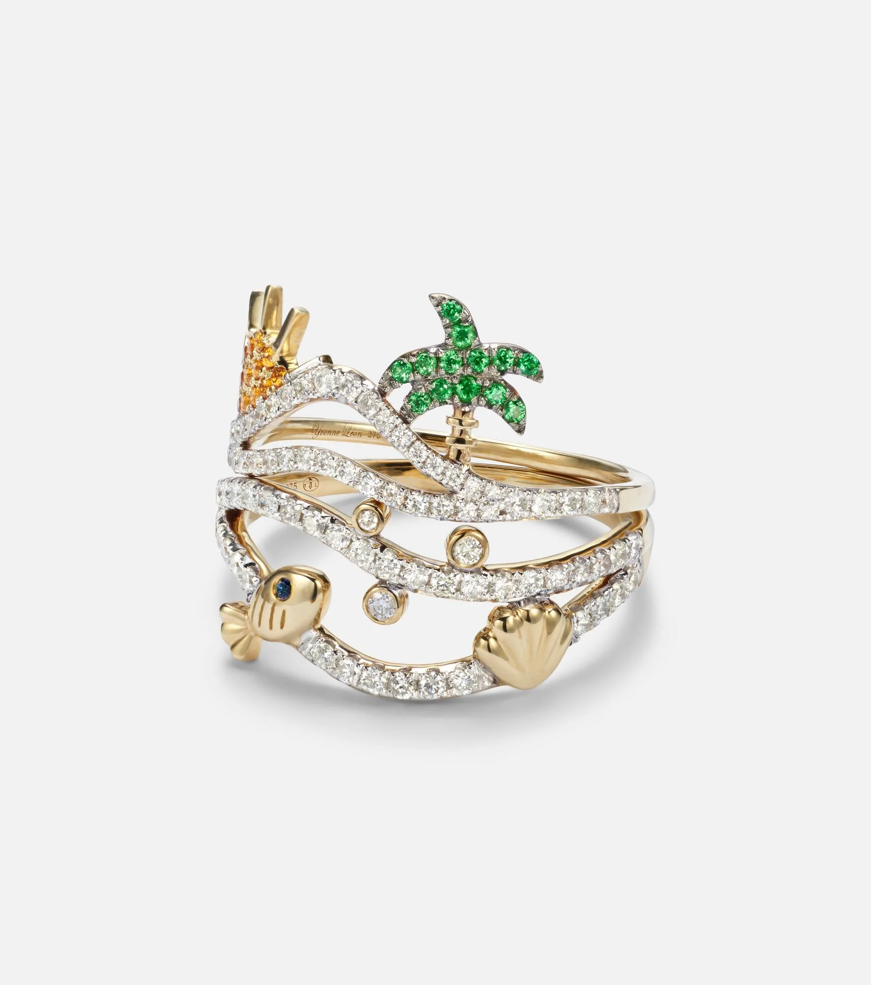 Yvonne Leon is known for her bold and modern designs with a touch of French flair. The La Plage And Sous L’Eau set of 2 rings is crafted from 9kt gold and dotted throughout with stunning diamonds. tsavorites, citrines, and blue sapphires. Product Details - Material: 9kt yellow gold - Made in France - Item color: gold - Stone I: diamonds - Stone II: tsavorites - Stone III: citrines - Stone IV: sapphires - Carat total weight (ctw): 0.656 - Item number: P01091776 Size & Fit - Max. width 8/17mm-0.3/0.65"