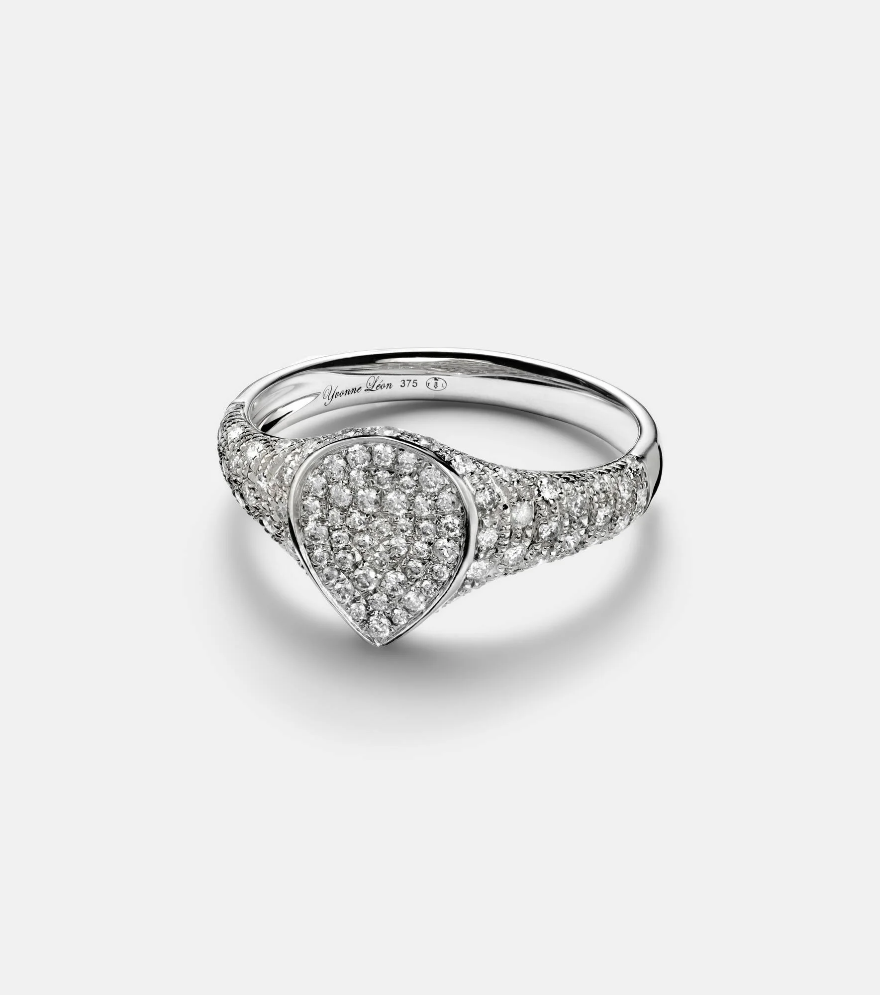 Made from 9kt white gold, this Yvonne Leon ring features a minute texture covering the sides of the band and the teardrop-shaped flat top. The Mini design is interspersed with glimmering diamonds that capture the light from every angle. Product Details - Material: 9kt white gold - Made in France - Item color: white gold - Stone I: diamonds, H color grade, round-cut, pave setting, 0.48ct - Item number: P01091802 Size & Fit - Max. width 10mm-0.4"