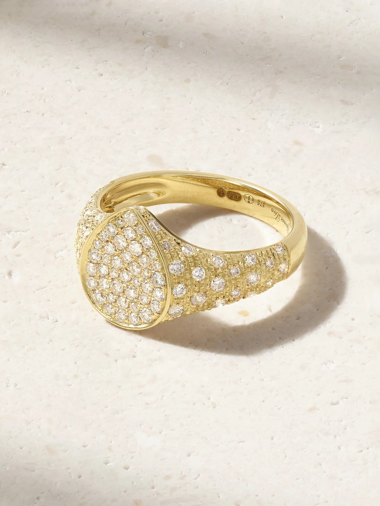 Yvonne Leon's vintage-inspired designs are all carefully handcrafted at her dedicated workshop in Paris. This signet ring is cast from 9-karat gold and studded with 0.48-carats of shimmering diamonds. Complement it with a bright red manicure.
