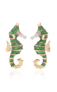 Drawing inspiration from France's unparalleled antiques and vintage markets, Paris-based jeweler Yvonne Léon pays tribute to the past while looking to the future with rebellious inflection. Cast from 18k yellow gold, these earrings feature a seahorse design that's set with diamonds, sapphires and tsavorites. PRODUCT DETAILS - Butterfly fastening for pierced ears - Composition: 18kt yellow gold; Diamonds 0,04ct; Pink sapphires 0,02ct; Tsavorites 0,44ct - Imported - Please note the possibility of natural inclusions in gemstones