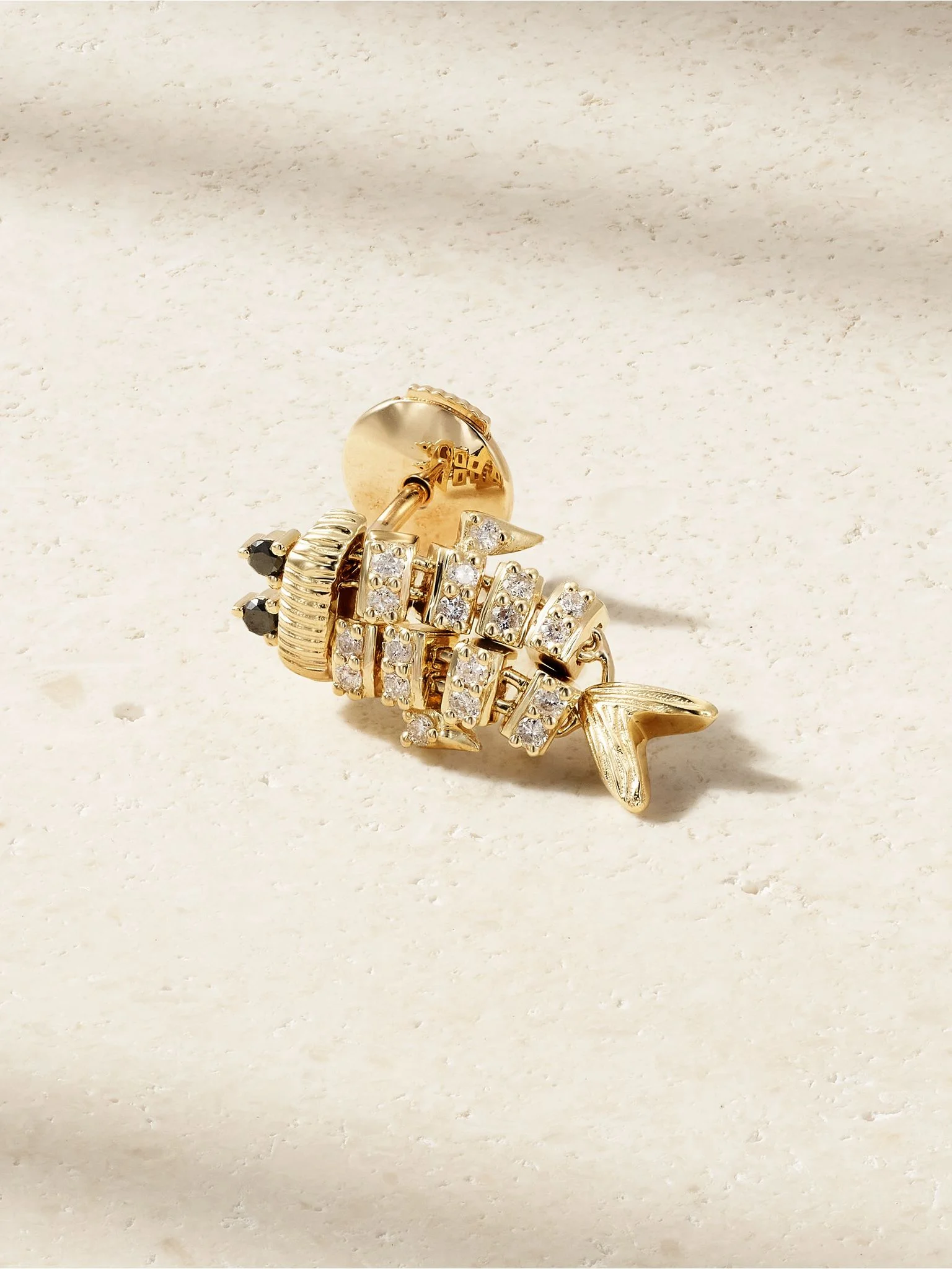 Yvonne Leon's earring is designed to look like a fish, with a clever hinged design that'll sway as you move. Handmade from 9-karat gold, it has blackened diamonds for eyes and gray ones as scales. It'll add a playful edge to your stack. Details & Care - Gray diamonds, total weight: 0.13-carats; blackened diamonds, total weight: 0.03-carats - Screw fastening for pierced ears - The black color of these diamonds is the result of an artificial treatment process - This piece has been certified in accordance with the Hallmarking Act 1973