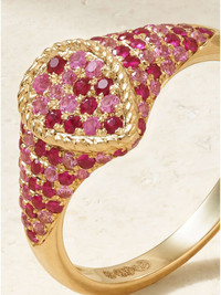 EDITORS'NOTES Yvonne Leon's vintage-inspired designs are all carefully handcrafted at her dedicated workshop in Paris. This signet ring is cast from 9-karat gold studded with rubies and tonal-pink sapphires. Complement it with a bright red manicure. SIZE & FIT - US sizing - Measurements can be found in the link below DETAILS & CARE - Rubies, total weight: 0.26-carats; sapphire, total weight: 0.25-carats - This piece has been certified in accordance with the Hallmarking Act 1973