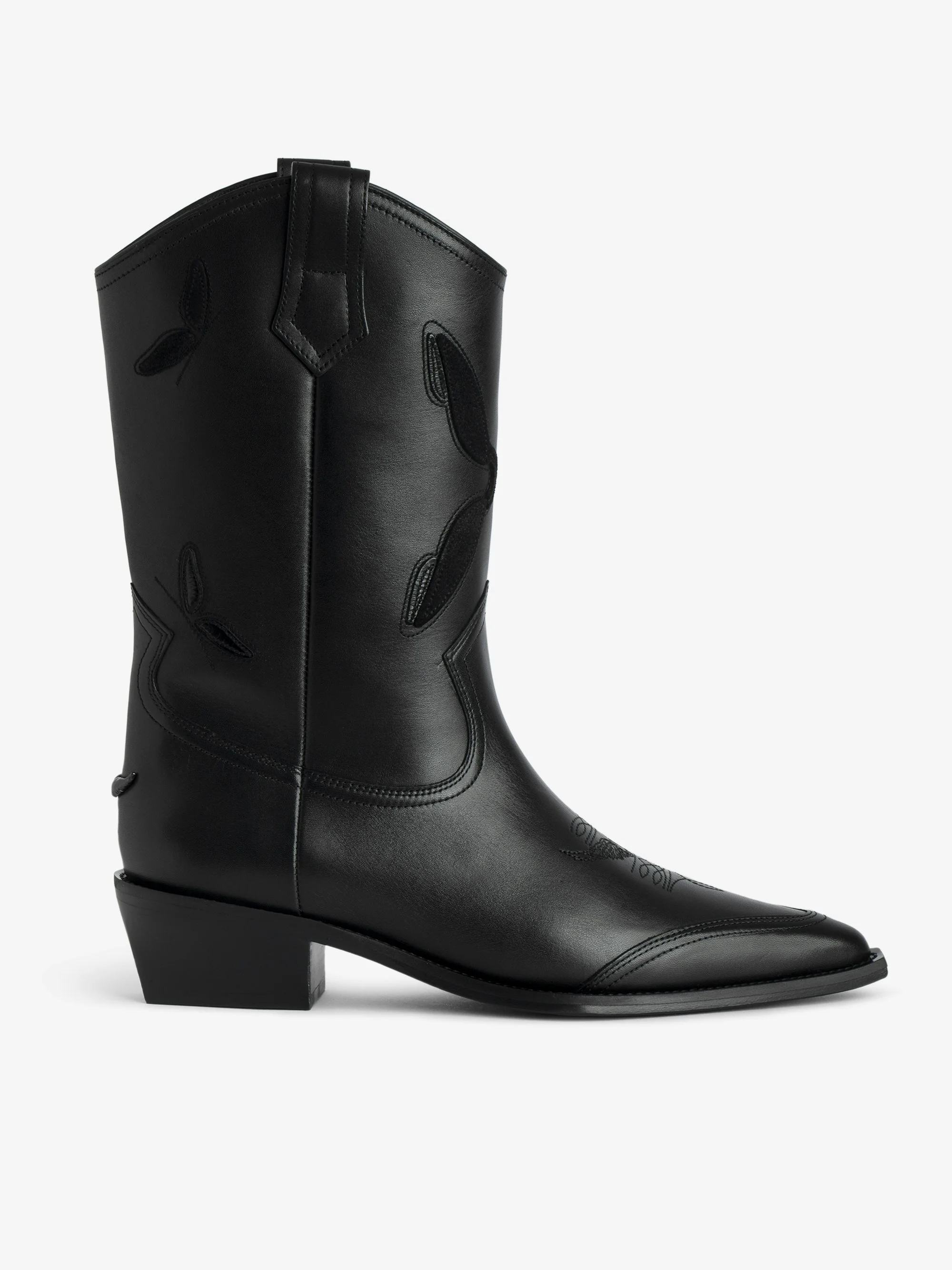 Bold, effortless, unstoppable. The Cara ankle boots redefine rock-chic with their sleek silhouette, pointed toe, and rebellious stacked heel. Crafted for those who walk with confidence, they’re the perfect balance of edgy and timeless. Wear them, own the night. Description & details - Women's black leather ankle boots - Butterfly wing embroidery, western stitching, and signature metal wings at the back - Side loops - Pointed toe, asymmetrical sole, and angled heel - Heel height: 4.5 cm - Made in Portugal This item is true to size. We recommend buying your usual size. Composition 100% Cow leather Care - Protect your leather item from humidity and any source of heat (radiator, sun) - Avoid your item coming into contact with water - Regularly maintain the shine of your smooth or grained leather shoes with a leather polish Product code: SWCT02026_BLACK