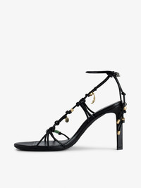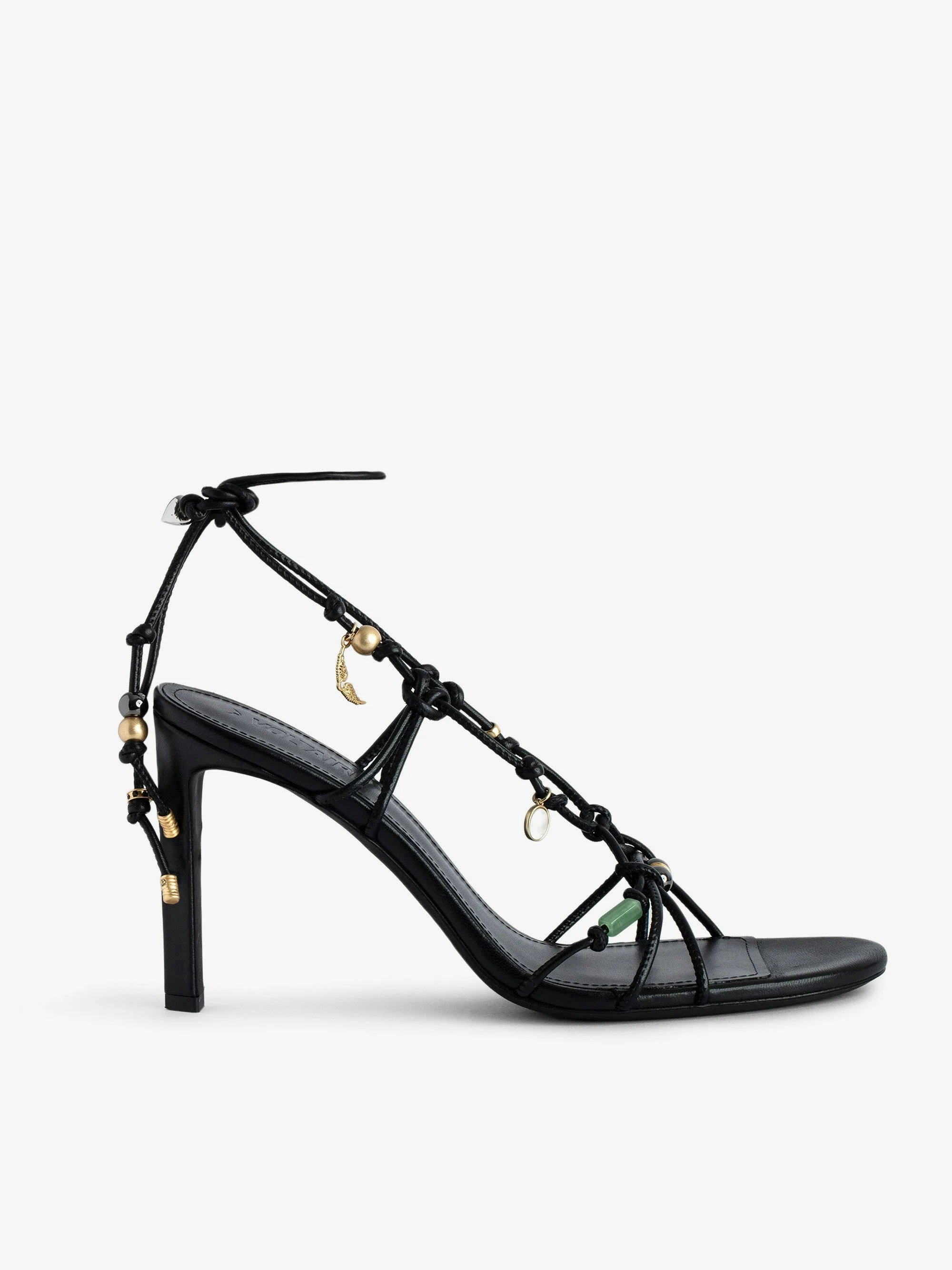 Women's black smooth leather heeled sandals with tied straps and charms. Description & details - Women’s black smooth leather sandals - Adjustable tied crossover straps with charms - Heel height: 3.5 in - Made in Portugal This item runs small. We recommend buying one size larger than your usual size. Composition 100% LAMBSKIN Care - Lambskin is extremely fragile and deserves to be treated with delicacy - Protect your leather item from humidity and any source of heat (radiator, sun) - Avoid your item coming into contact with water - Regularly maintain the shine of your smooth or grained leather shoes with a leather polish Product code: SWCT00848_NOIR