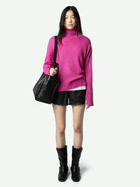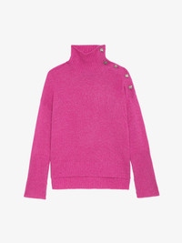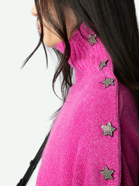Fuchsia pink cashmere sweater with funnel neck and diamante star buttons on the shoulder. Description & details - Women's Clematis fuchsia pink cashmere sweater - Funnel neck and diamante star button fastening on shoulder - Long sleeves, holes for thumbs and ribbed edges - Pointelle ZV signature Model is 178 cm / 5' 10" and is wearing a size S This item is true to size. We recommend buying your usual size. Composition 85% Cashmere 10% Polyester 5% Metallic fiber Care - Hand-wash or machine-wash on a 20°C wool cycle with a maximum spin speed of 400 rpm - Do not wring - Air dry flat - Iron inside out at a maximum of 110°C, avoiding any customised details Product code: KWSW01645_CLEMATIS