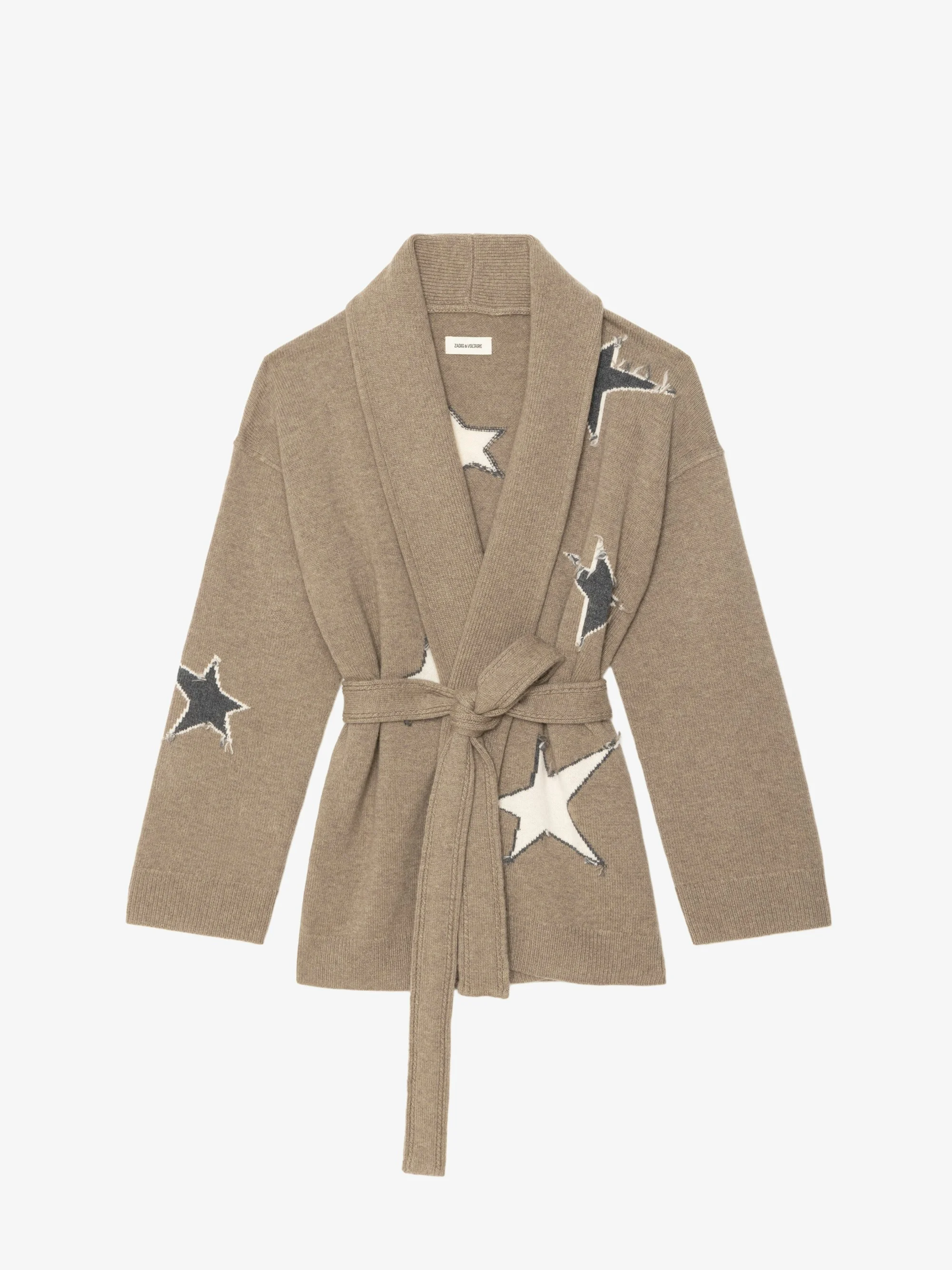 Coat with intarsia stars. Description & details - Mid-length cardigan coat in 100% cashmere - Intarsia star pattern - V-neck - Cross-over closure with belt - Long sleeves - Straight cut Model is 181 cm / 5' 11" and is wearing a size XS/S This item fits true to size. Choose your usual size. Composition 90% Merino wool* 10% Cashmere Care - Hand-wash or machine-wash on a 20°C wool cycle with a maximum spin speed of 400 rpm - Do not wring - Air dry flat - Iron inside out at a maximum of 110°C, avoiding any customised details Product code: KWCO01538_LATTE