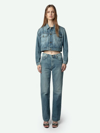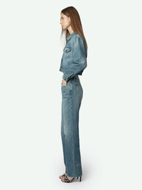 Women's medium wash cropped denim jacket with Warner Bros. patch on back. Description & details - Women's medium wash cropped denim jacket - Button closure down front - Two flap chest pockets - Two side pockets - Hidden love note inside waistband with "Someone in Paris loves me" embroidery - Warner Bros. patch on back Composition 55% COTTON 45% COTTON** Product code: WWOW00642_Medium Wash