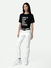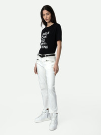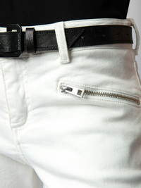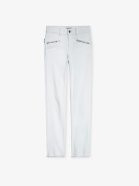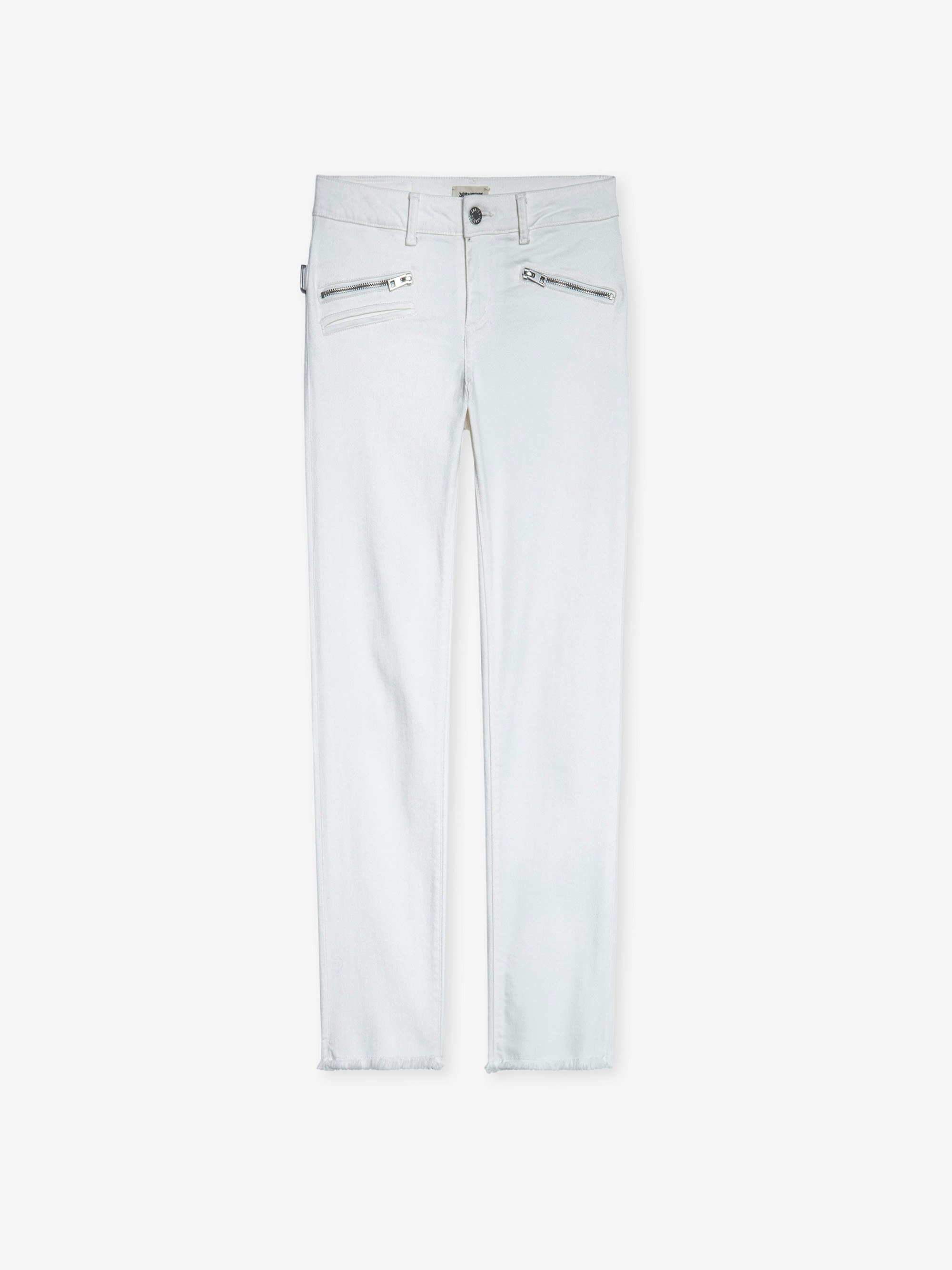 Women's white slim jeans. Description & details Zadig&Voltaire’s iconic Ava slim-fit jeans feature zipped pockets and raw edges for a casual and timeless rock “n” roll style. - Zadig&Voltaire Women’s slim-fit ecru jeans in slightly stretch cotton - Cropped - Raw hems - Zipped front pockets - 1 welt pocket - Belt loops - Metal half-moon on the sides - ZADIG&VOLTAIRE leather label on back Model is 180 cm and is wearing a size S Model is 180 cm / 5' 10" and is wearing a size S This item is true to size. We recommend buying your usual size. Composition 98% COTTON* 2% ELASTANE Care - Machine-wash inside out on a 30°C delicate cycle with similar colours - Air dry - Iron inside out at a maximum of 150°C, or in case of customised details, at a maximum of 110°C avoiding the customised details Product code: PWGCT3003F_JUDO