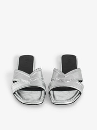A harmonious blend of edgy design and luxurious craftsmanship. These mules feature a metallic crinkled leather exterior, exuding a bold yet sophisticated allure. The embossed signature wings add a distinctive touch, embodying the brand's rebellious spirit. Designed with a square toe and crossover strap at the toe, they offer both style and comfort. Description & details - Metallic crinkled leather mules - Embossed signature wings - Square toe - Heel height: 1.5 cm - Made in Spain This item is true to size. We recommend buying your usual size. Composition 100% Cow leather Care - Protect your leather item from humidity and any source of heat (radiator, sun) - Avoid your item coming into contact with water - Regularly maintain the shine of your smooth or grained leather shoes with a leather polish Product code: SWCT01939_SILVER