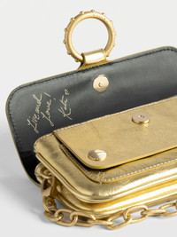 Mini bag in metallic leather with metal ring and chain. Description & details - Mini bag in metallic leather - Designed by Kate Moss for Zadig&Voltaire - "Kate Moss: Live and Love" signature - Detachable metal chain - Flap with magnetic closure - Two compartments separated by a zippered pocket and 2 card slots - Wings, metal ring engraved "Kate Loves Zadig&Voltaire" and studded piping - Carried by hand, on the shoulder or crossbody 16 x 8.5 x 3.5 cm. Shoulder strap/chain height: 39.5 cm Composition 100% Cow leather Care - Protect your leather item from moisture and any source of heat (radiator, sun) - Avoid contact between your item and water - Do not apply any product or cream on this type of leather - Do not overload the bag to ensure its longevity - In case of a stain, please take your item to a leather care professional - Make sure your item does not rub against abrasive surfaces Product code: LWBA04345_GOLD