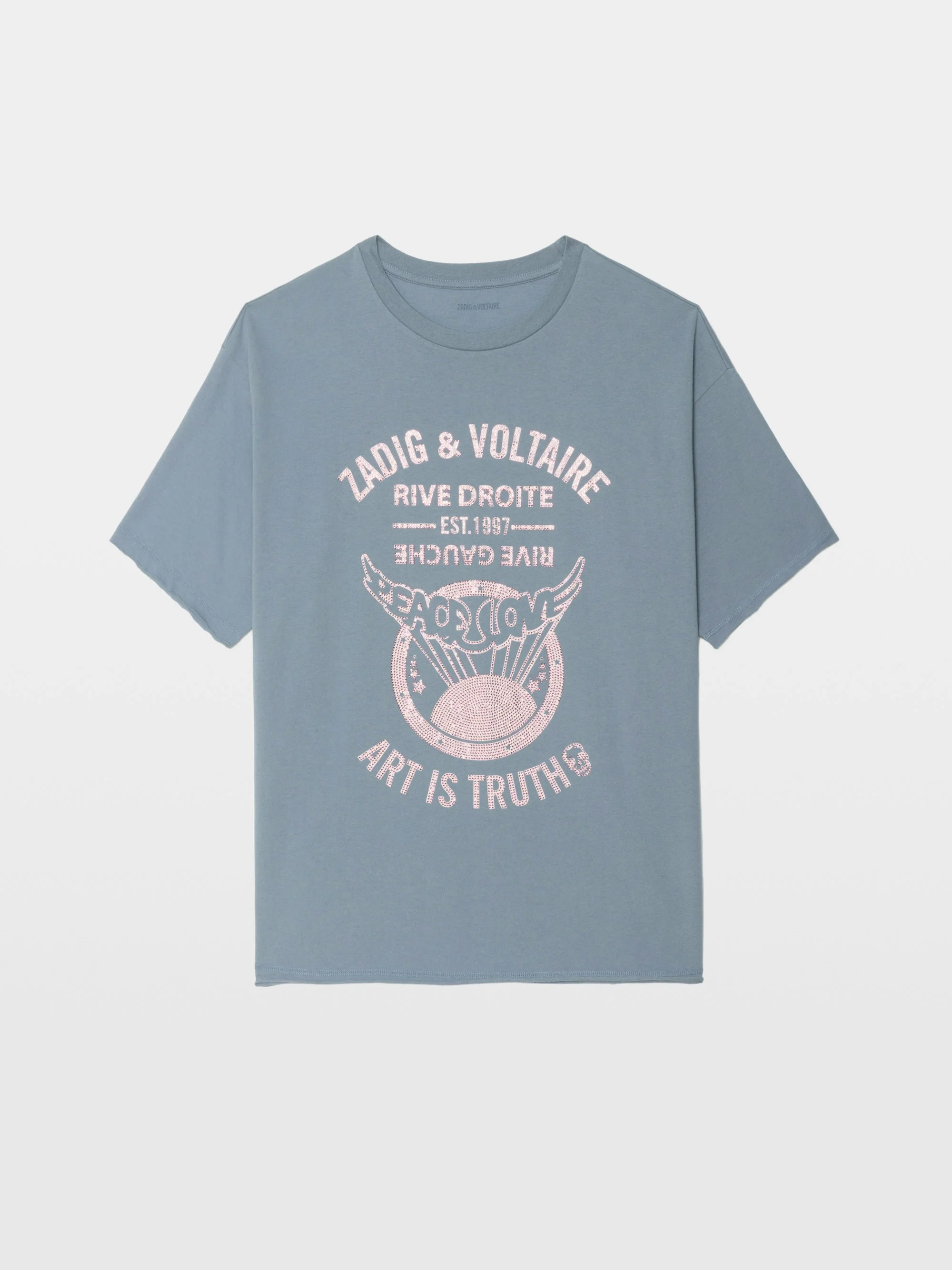 Short-sleeved T-shirt with a rhinestone crest. Description & details - 100% cotton T-shirt - Peace crest with rhinestones - Round neck - Short sleeves Model is 178 cm / 5' 10" and is wearing a size S This item has a loose fit. For a more fitted look, choose one size down from your usual size. Composition 100% Cotton* Care - Machine-wash inside out on a 30°C delicate cycle with similar colours - Air dry - Iron inside out at a maximum of 110°C, avoiding any customised details Product code: JWTS02903_SIXTINE